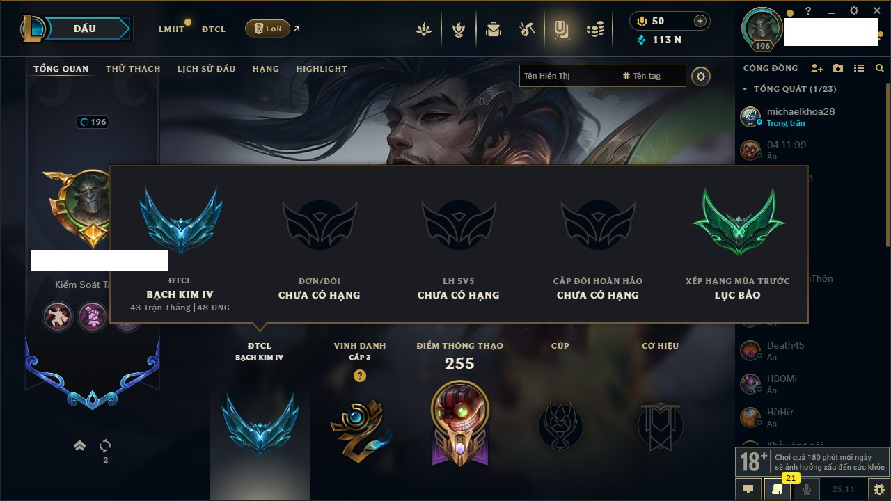 Rank Đơn: Chưa rank mùa nào Khung: Chưa có khung Tướng: 3 - Còn 9500 THX Trang Phục: 0 Rank ĐTCL: Bạch Kim IV Linh Thú: 21
