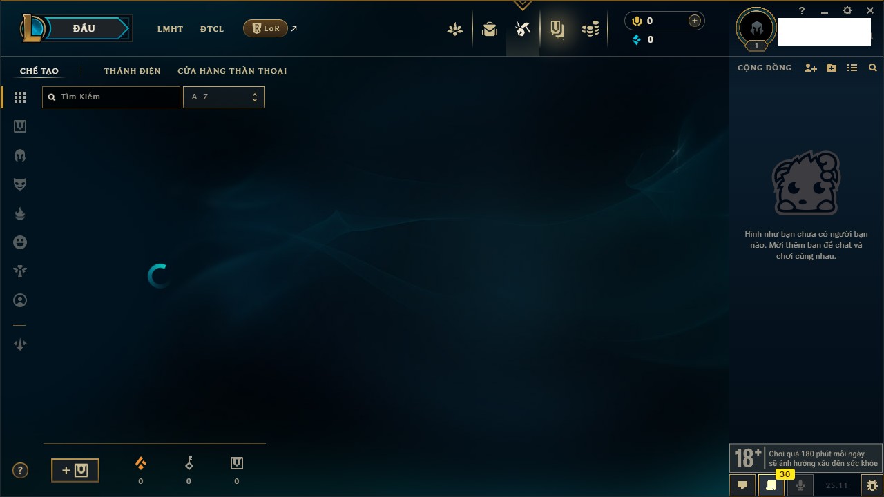 Rank Đơn: Lục Bảo IVKhung: VàngTướng: 171 - Còn 154648 THXTrang Phục: 203Rank ĐTCL: Bạch Kim IVLinh Thú: 69