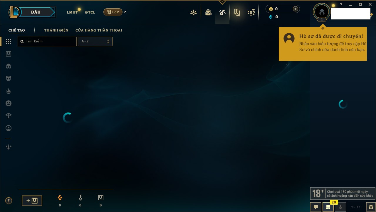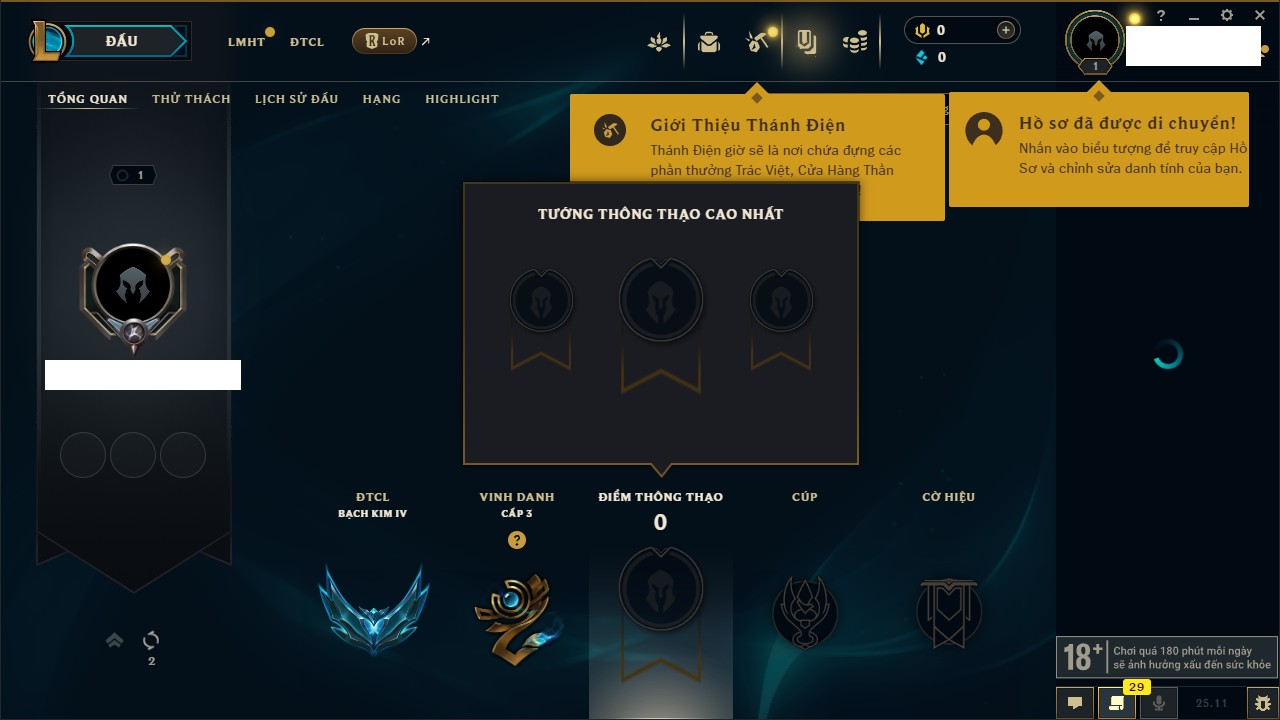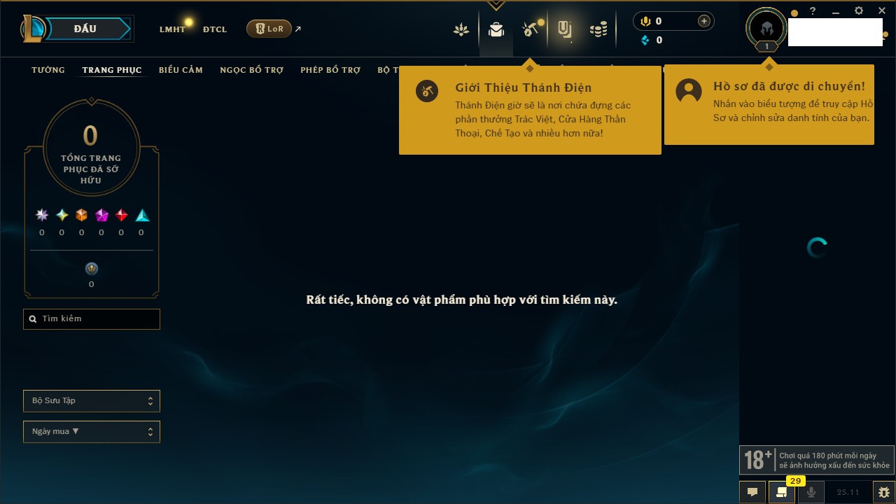 Rank Đơn: Chưa rank mùa nào Khung: Chưa có khung Tướng: 166 - Còn 3090 THX Trang Phục: 9 Rank ĐTCL: Chưa Rank Linh Thú: 125