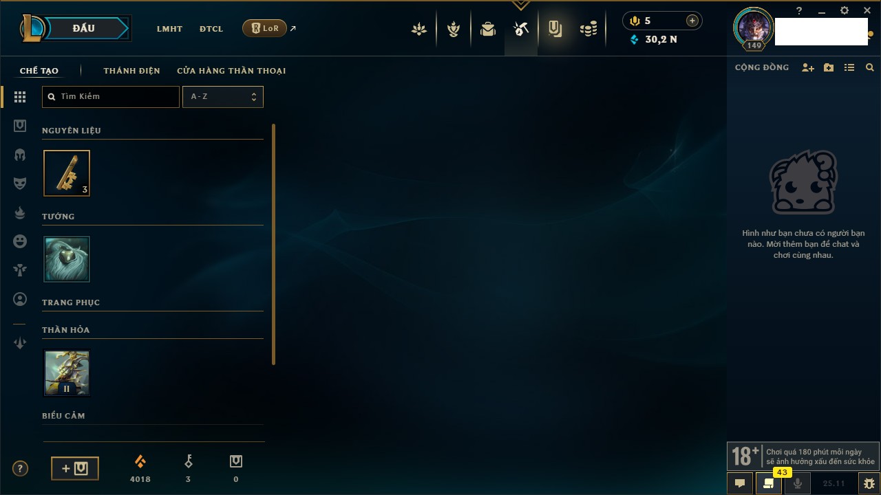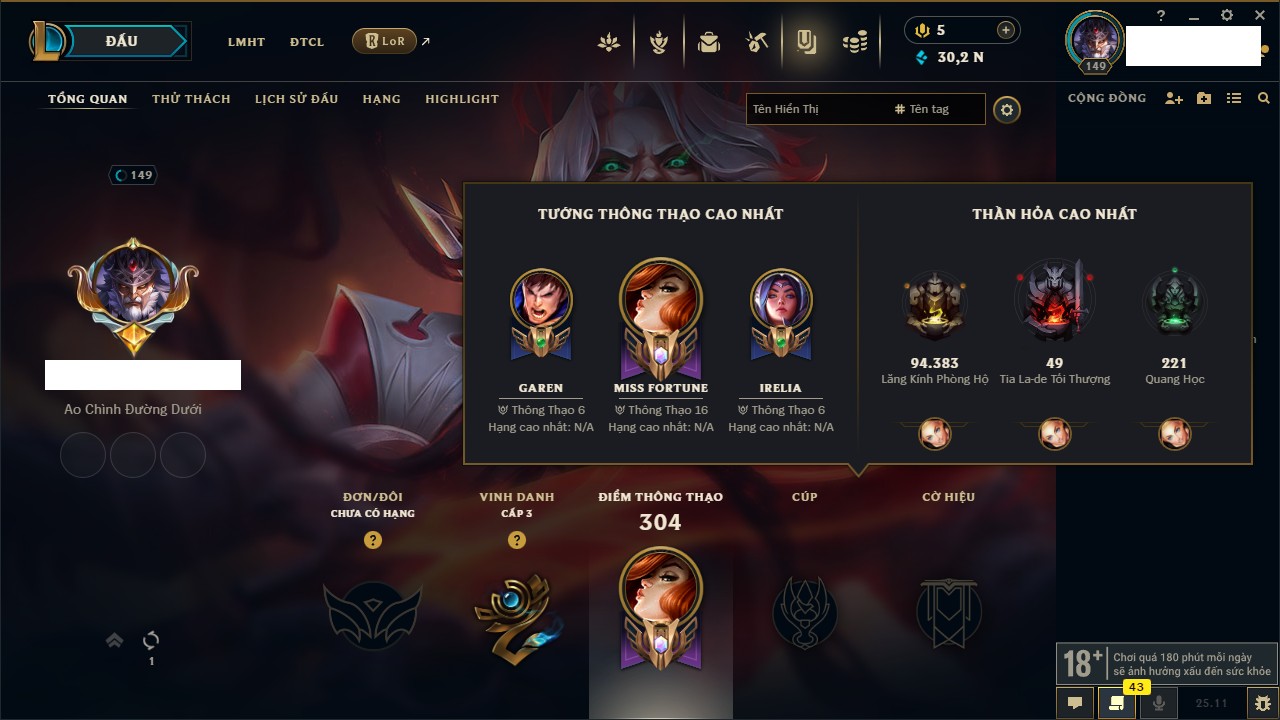 Rank Đơn: Lục Bảo IVKhung: VàngTướng: 171 - Còn 154648 THXTrang Phục: 203Rank ĐTCL: Bạch Kim IVLinh Thú: 69