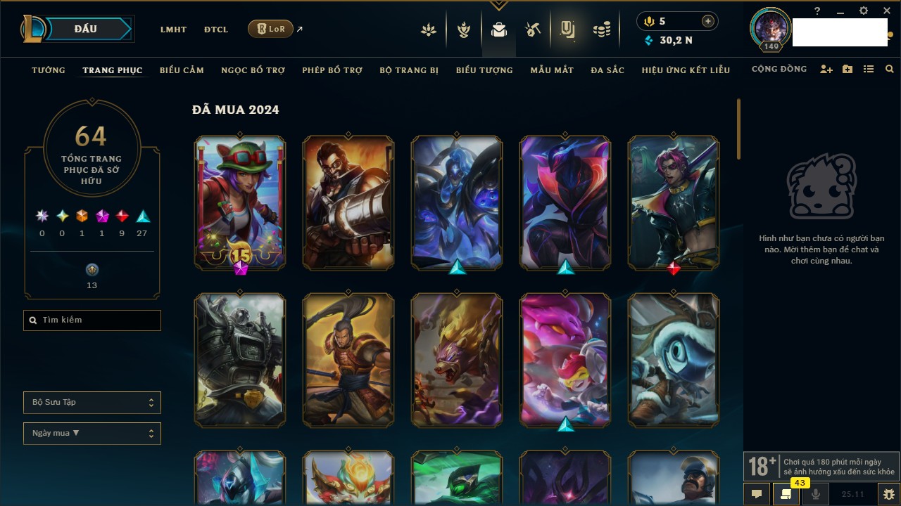 Rank Đơn: Đồng IIKhung: ĐồngTướng: 170 - Còn 95773 THXTrang Phục: 170Rank ĐTCL: Chưa RankLinh Thú: 32