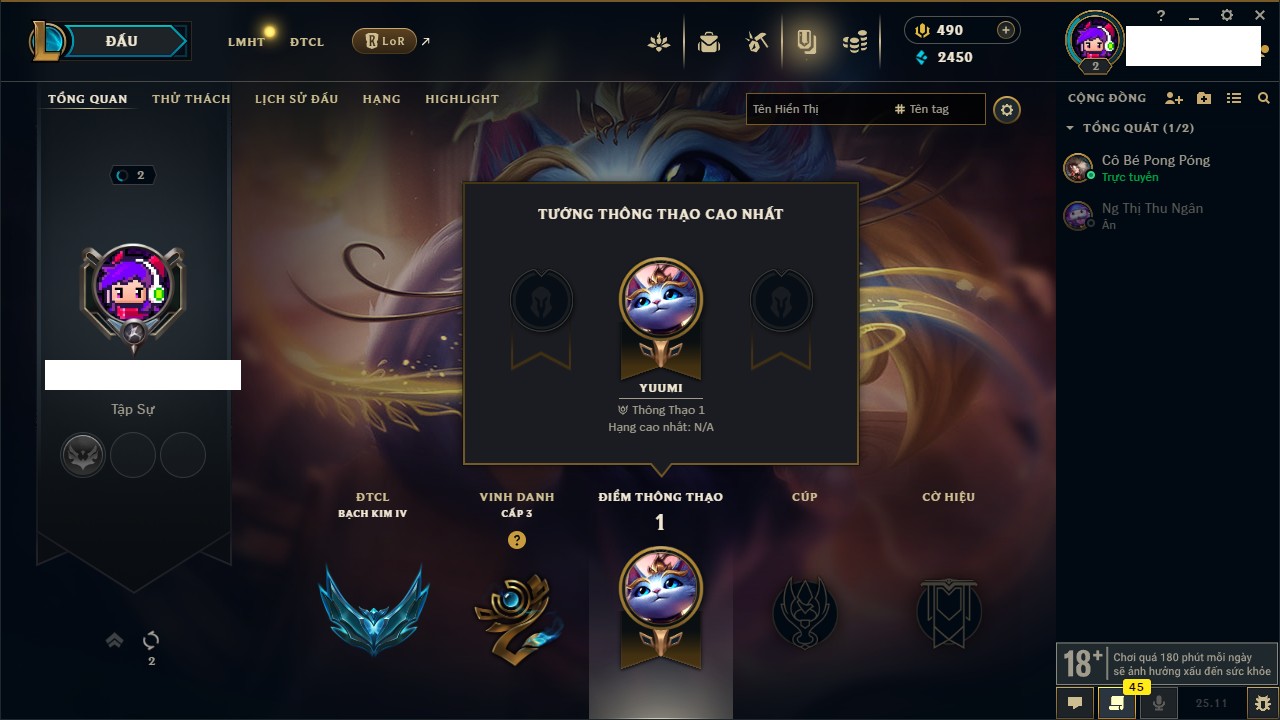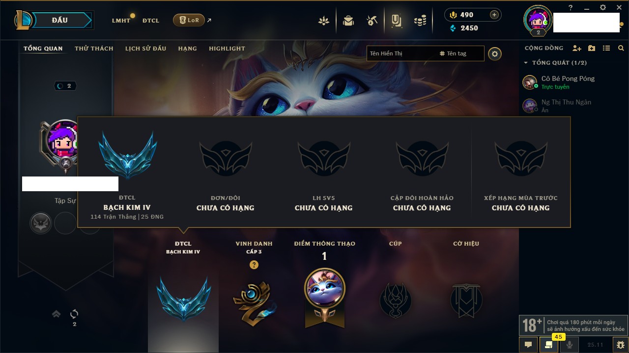 Rank Đơn: Bạc IV Khung: Vàng Tướng: 172 - Còn 11123 THX Trang Phục: 288 Rank ĐTCL: Vàng IV Linh Thú: 117
