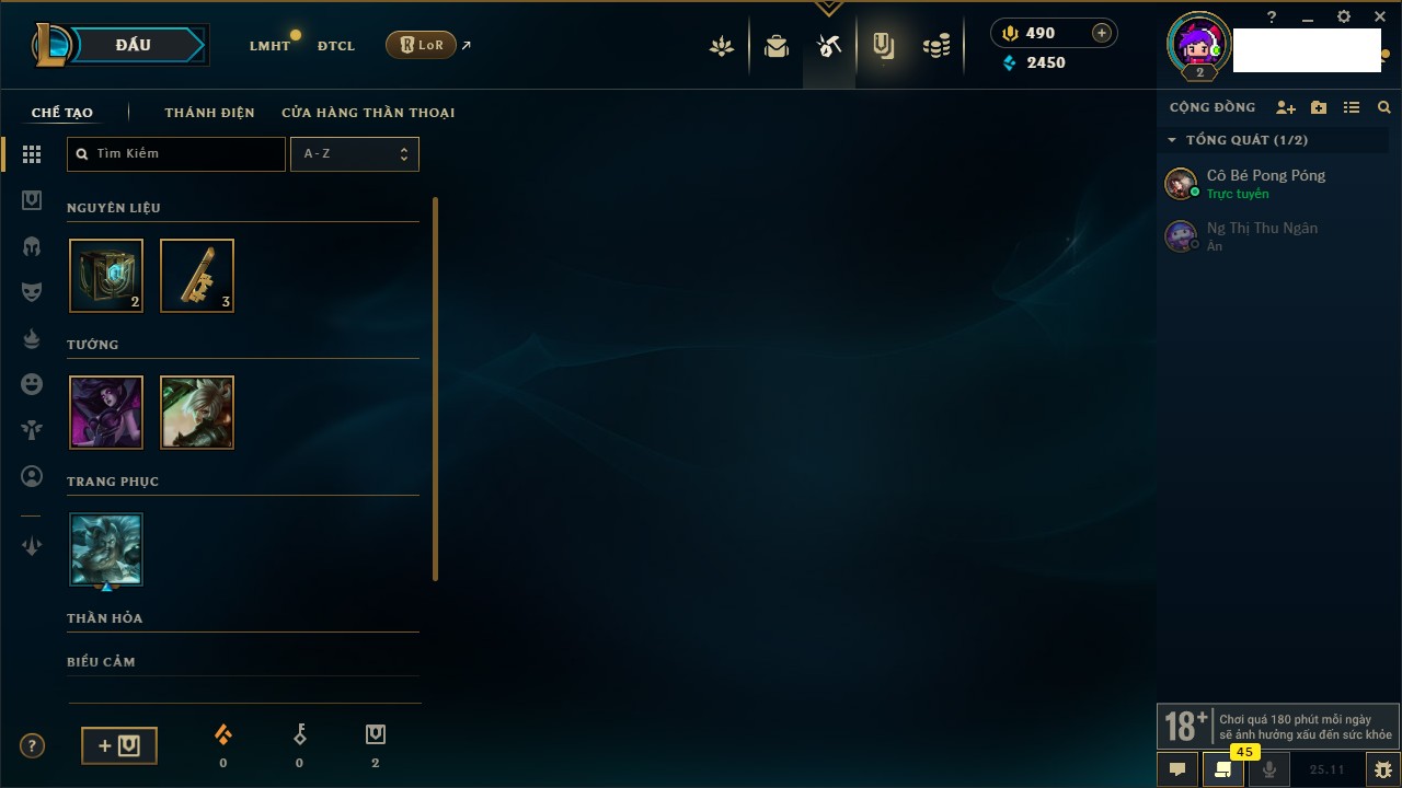 Rank Đơn: Chưa Rank Khung: Chưa có khung Tướng: 104 - Còn 10052 THX Trang Phục: 52 Rank ĐTCL: Chưa Rank Linh Thú: 155