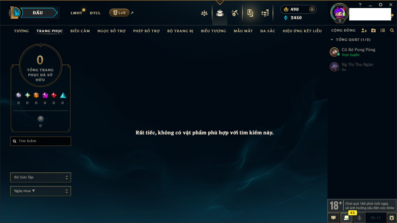 Rank Đơn: Chưa Rank Khung: Chưa có khung Tướng: 169 - Còn 329 THX Trang Phục: 137 Rank ĐTCL: Chưa Rank Linh Thú: 292