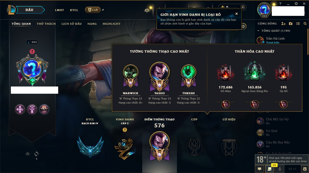 Rank Đơn: Bạch Kim IIKhung: Bạch kimTướng: 171 - Còn 316137 THXTrang Phục: 89Rank ĐTCL: Bạch Kim IIILinh Thú: 94