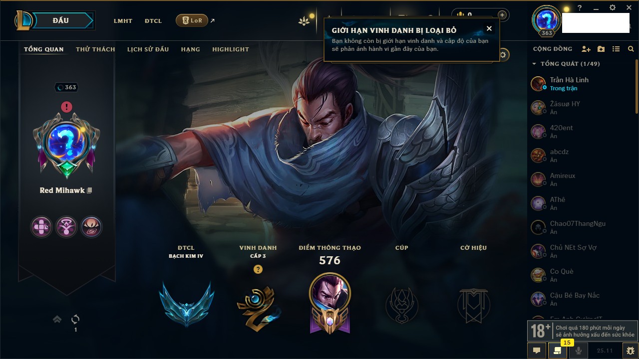 Rank Đơn: Lục Bảo IVKhung: VàngTướng: 171 - Còn 154648 THXTrang Phục: 203Rank ĐTCL: Bạch Kim IVLinh Thú: 69