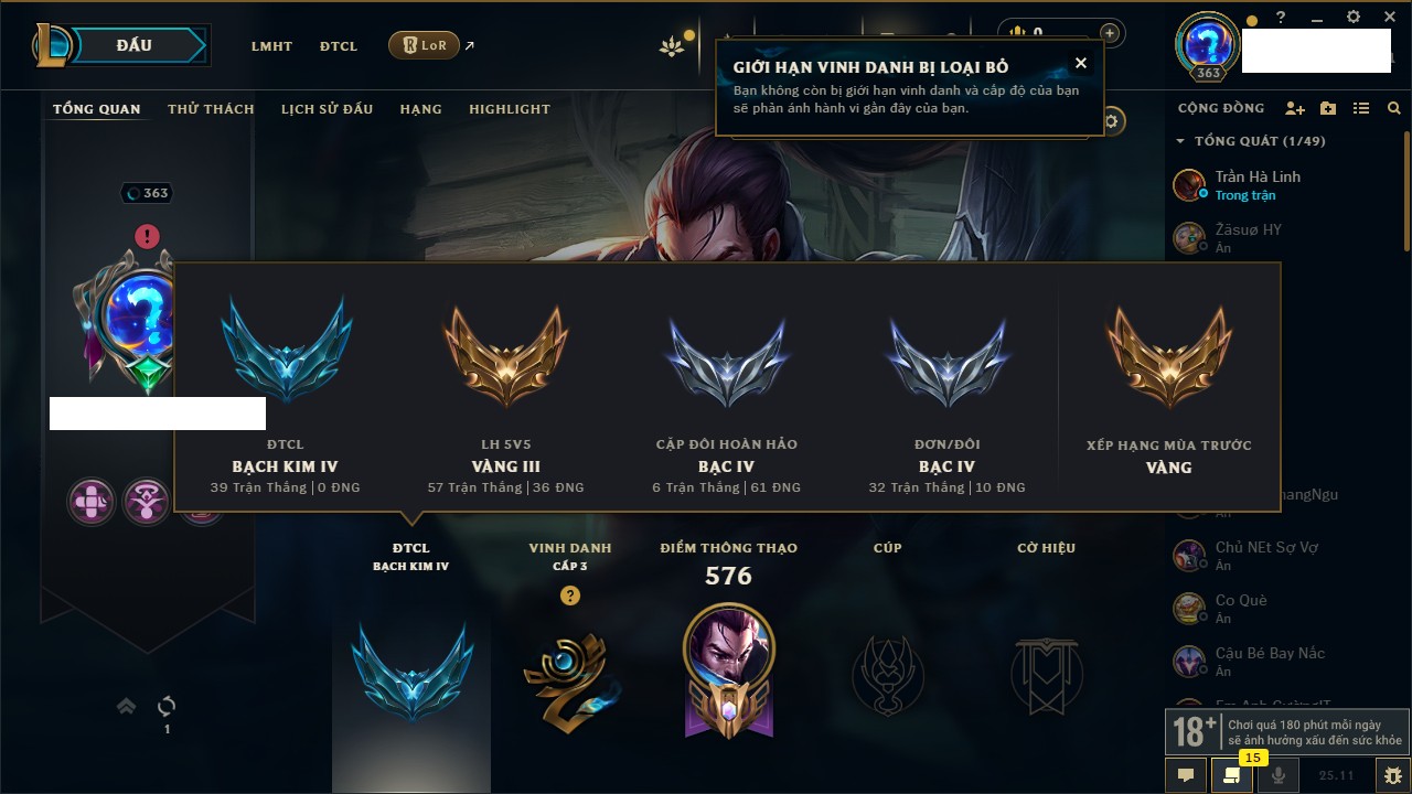 Rank Đơn: Bạch Kim IIIKhung: Bạch kimTướng: 171 - Còn 136108 THXTrang Phục: 261Rank ĐTCL: Bạc IVLinh Thú: 73