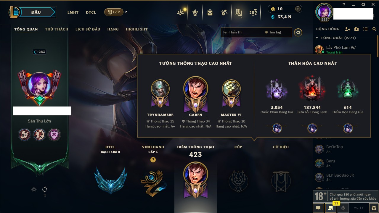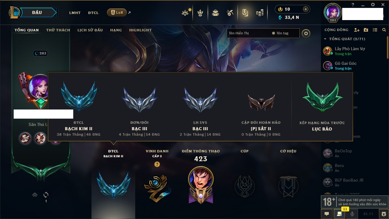 Rank Đơn: Bạch Kim IIIKhung: VàngTướng: 126 - Còn 23055 THXTrang Phục: 114Rank ĐTCL: Chưa RankLinh Thú: 21
