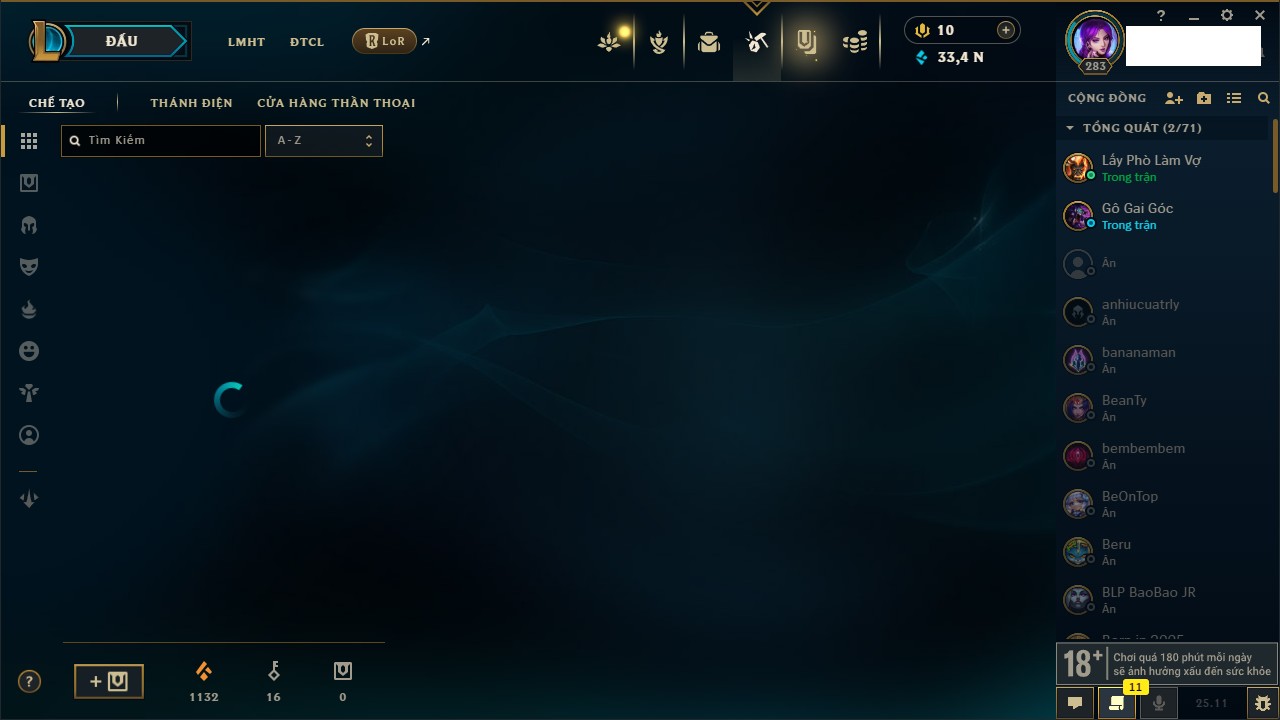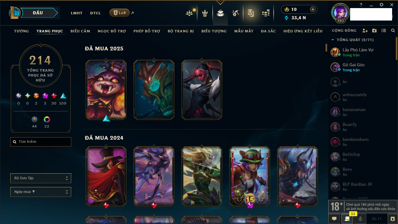 Rank Đơn: Vàng IIKhung: VàngTướng: 171 - Còn 34018 THXTrang Phục: 250Rank ĐTCL: Sắt IILinh Thú: 19