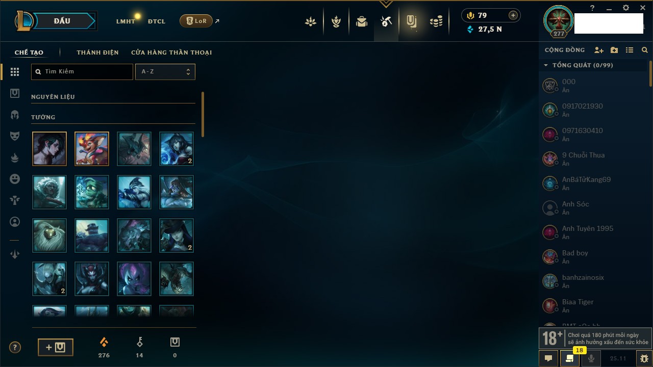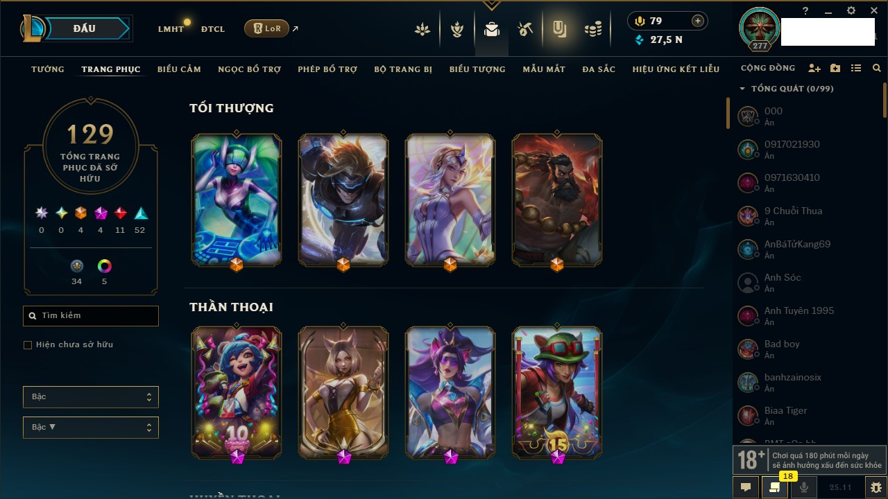 Rank Đơn: Vàng IVKhung: VàngTướng: 171 - Còn 48721 THXTrang Phục: 171Rank ĐTCL: Chưa RankLinh Thú: 27