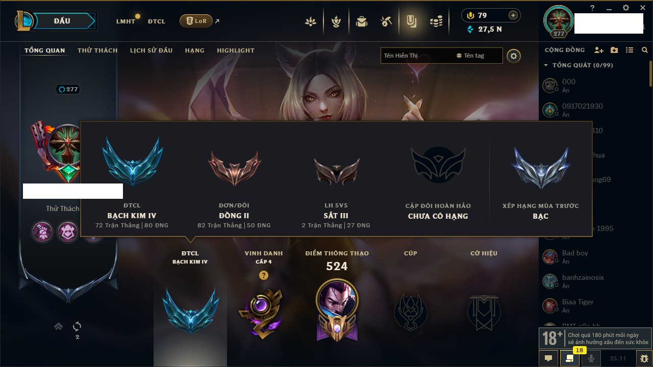 Rank Đơn: Bạc IIKhung: VàngTướng: 171 - Còn 332462 THXTrang Phục: 165Rank ĐTCL: Kim Cương IVLinh Thú: 181