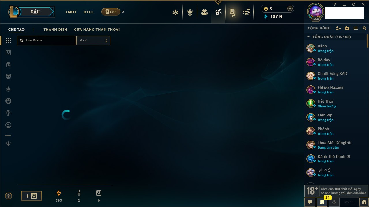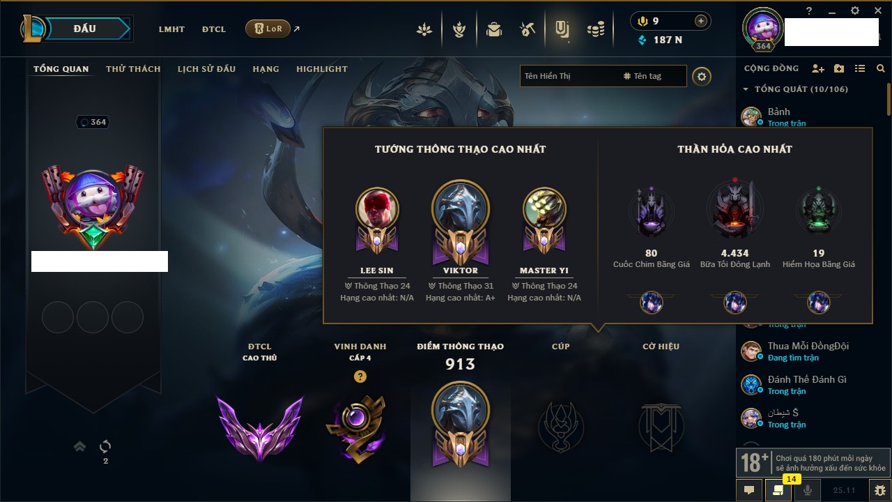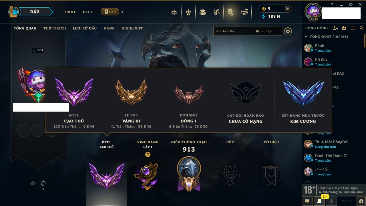 Rank Đơn: Vàng IKhung: BạcTướng: 171 - Còn 60584 THXTrang Phục: 286Rank ĐTCL: Vàng IIILinh Thú: 117