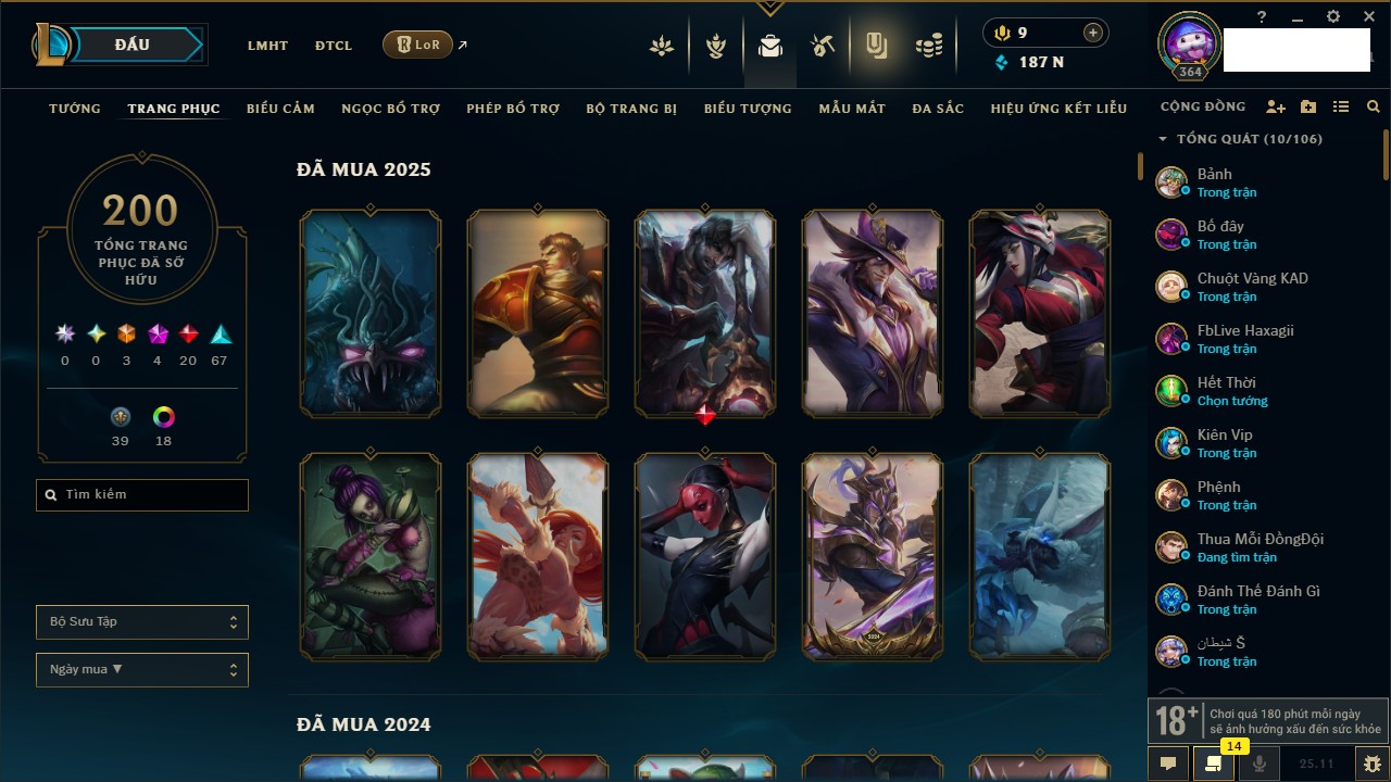 Rank Đơn: Vàng IIIKhung: VàngTướng: 171 - Còn 88128 THXTrang Phục: 329Rank ĐTCL: Chưa RankLinh Thú: 41
