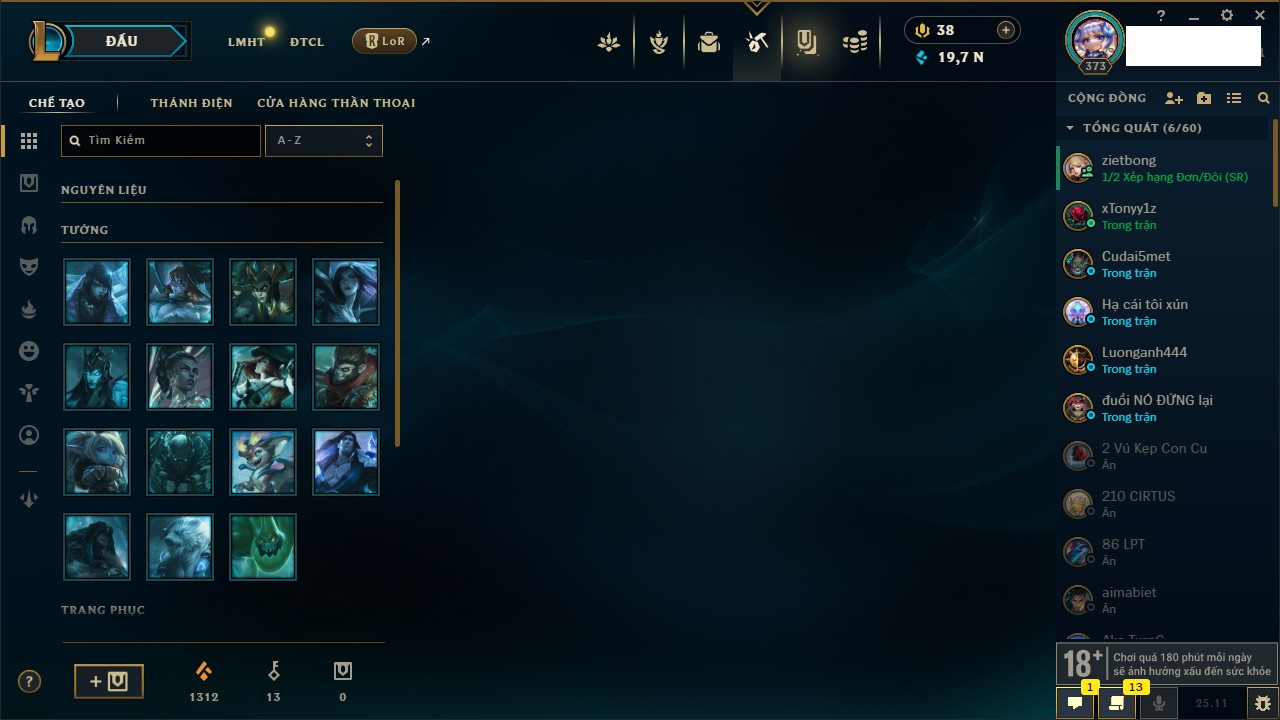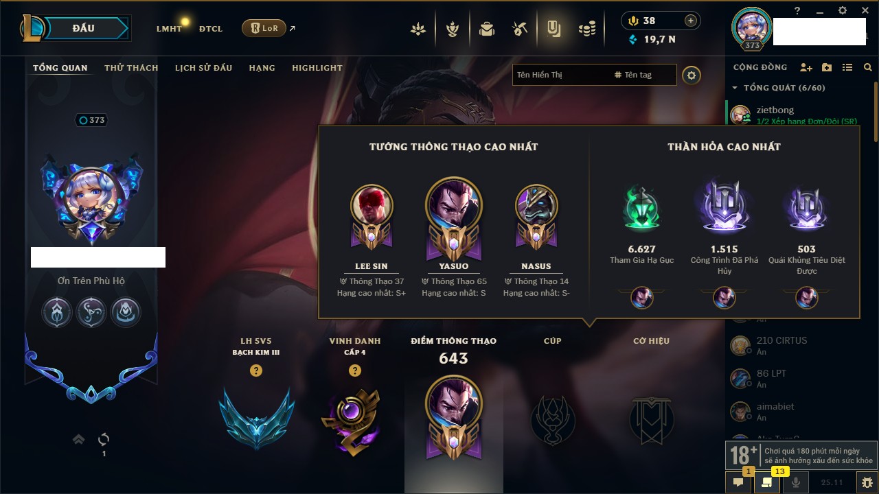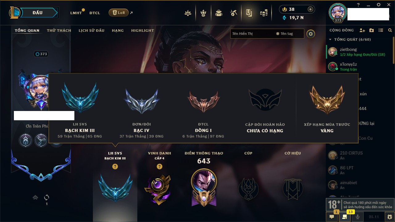 Rank Đơn: Vàng IKhung: BạcTướng: 171 - Còn 60584 THXTrang Phục: 286Rank ĐTCL: Vàng IIILinh Thú: 117
