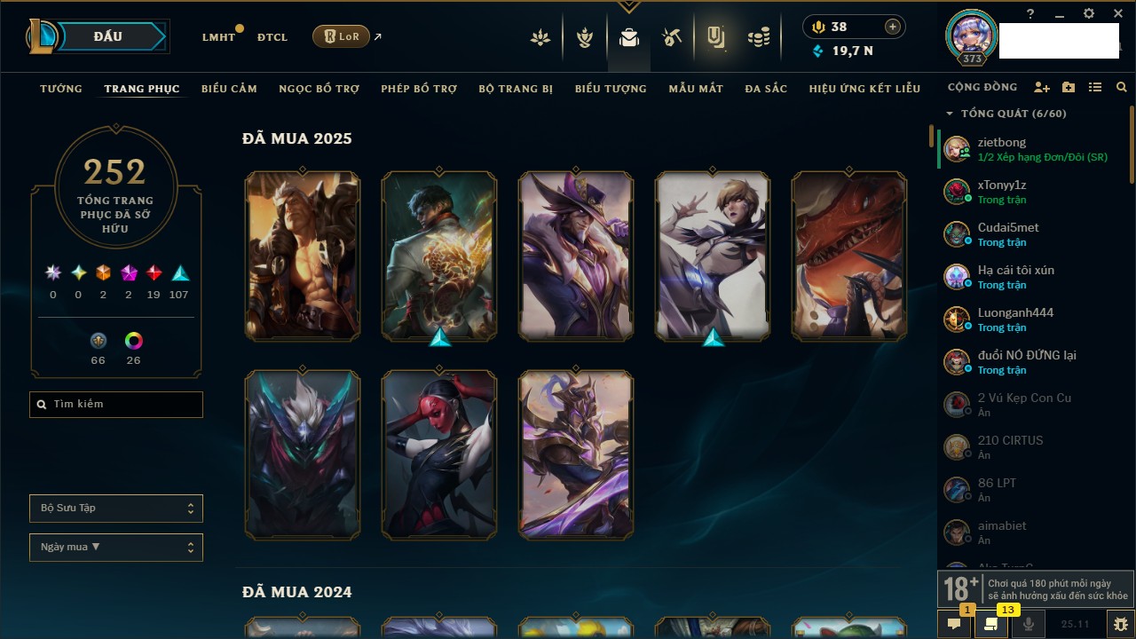 Rank Đơn: Vàng IIIKhung: VàngTướng: 171 - Còn 88128 THXTrang Phục: 329Rank ĐTCL: Chưa RankLinh Thú: 41