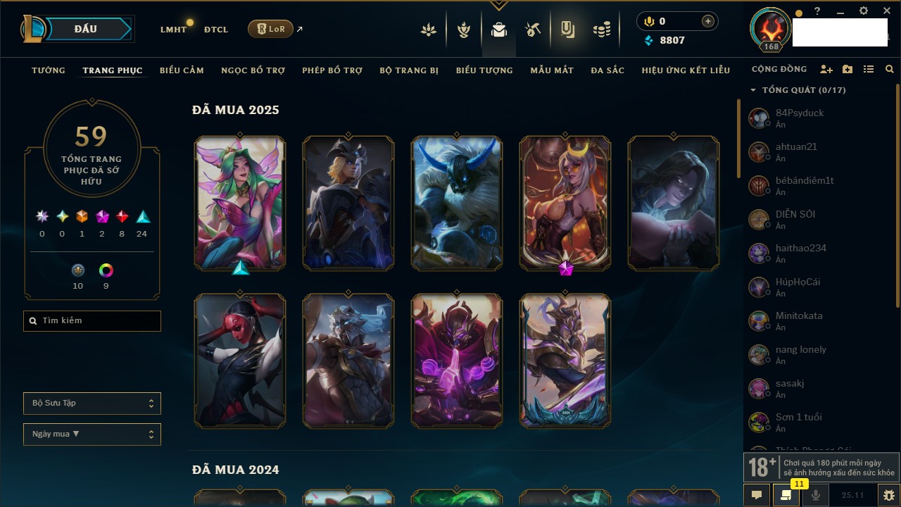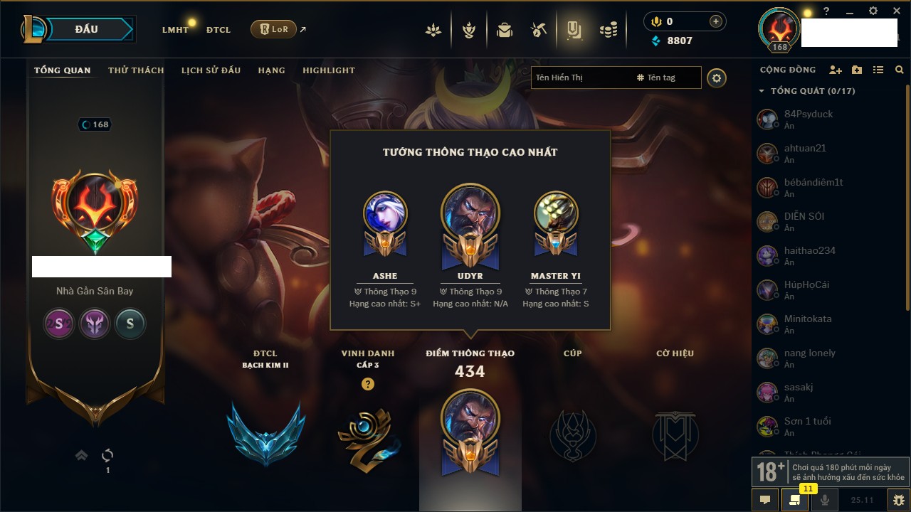 Rank Đơn: Đồng IKhung: Chưa có khungTướng: 130 - Còn 4038 THXTrang Phục: 151Rank ĐTCL: Chưa RankLinh Thú: 45