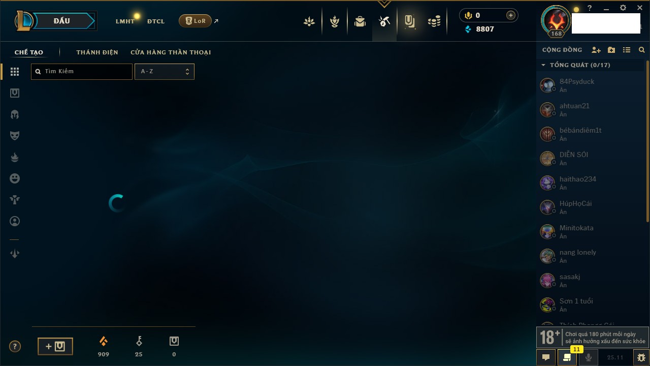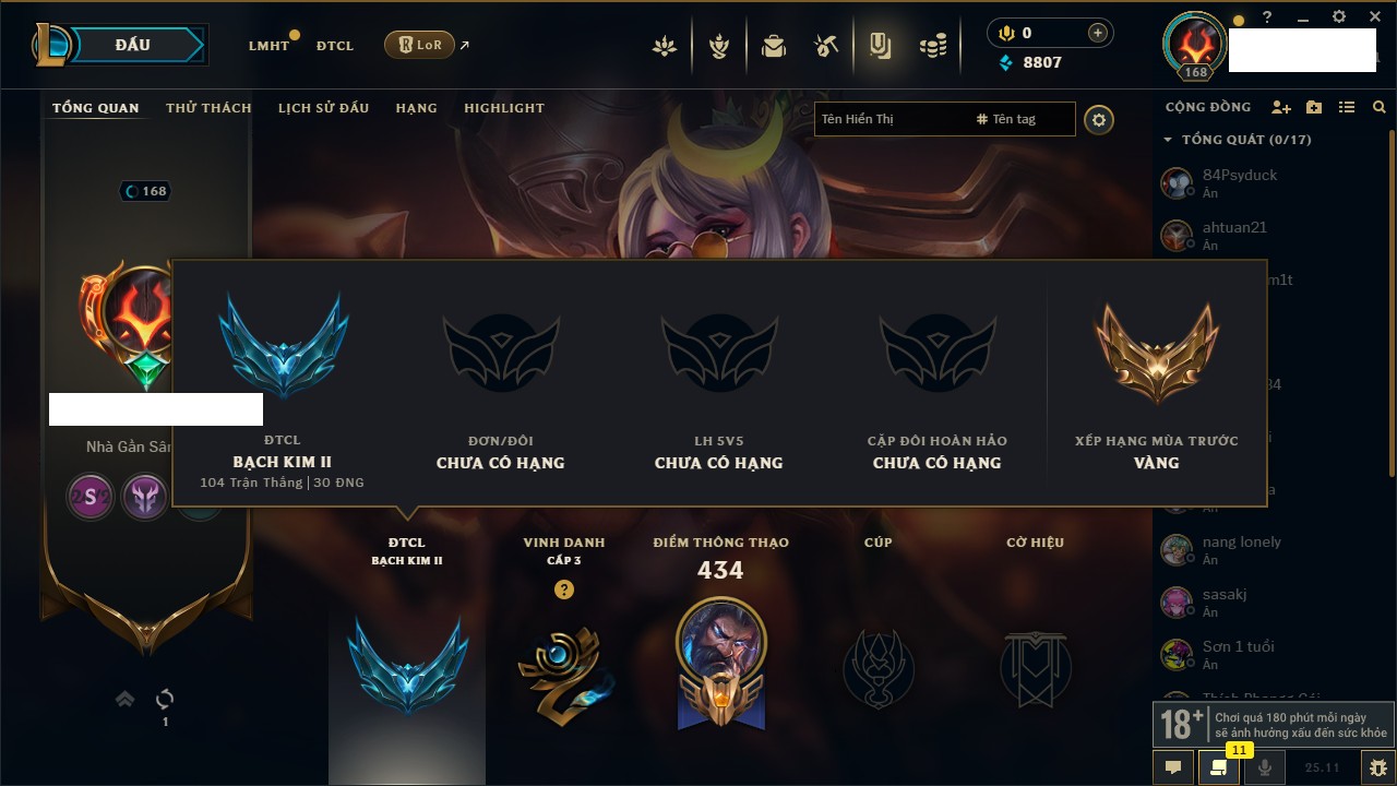 Rank Đơn: Chưa RankKhung: Chưa có khungTướng: 0 - Còn 0 THXTrang Phục: 0Rank ĐTCL: Chưa RankLinh Thú: 8