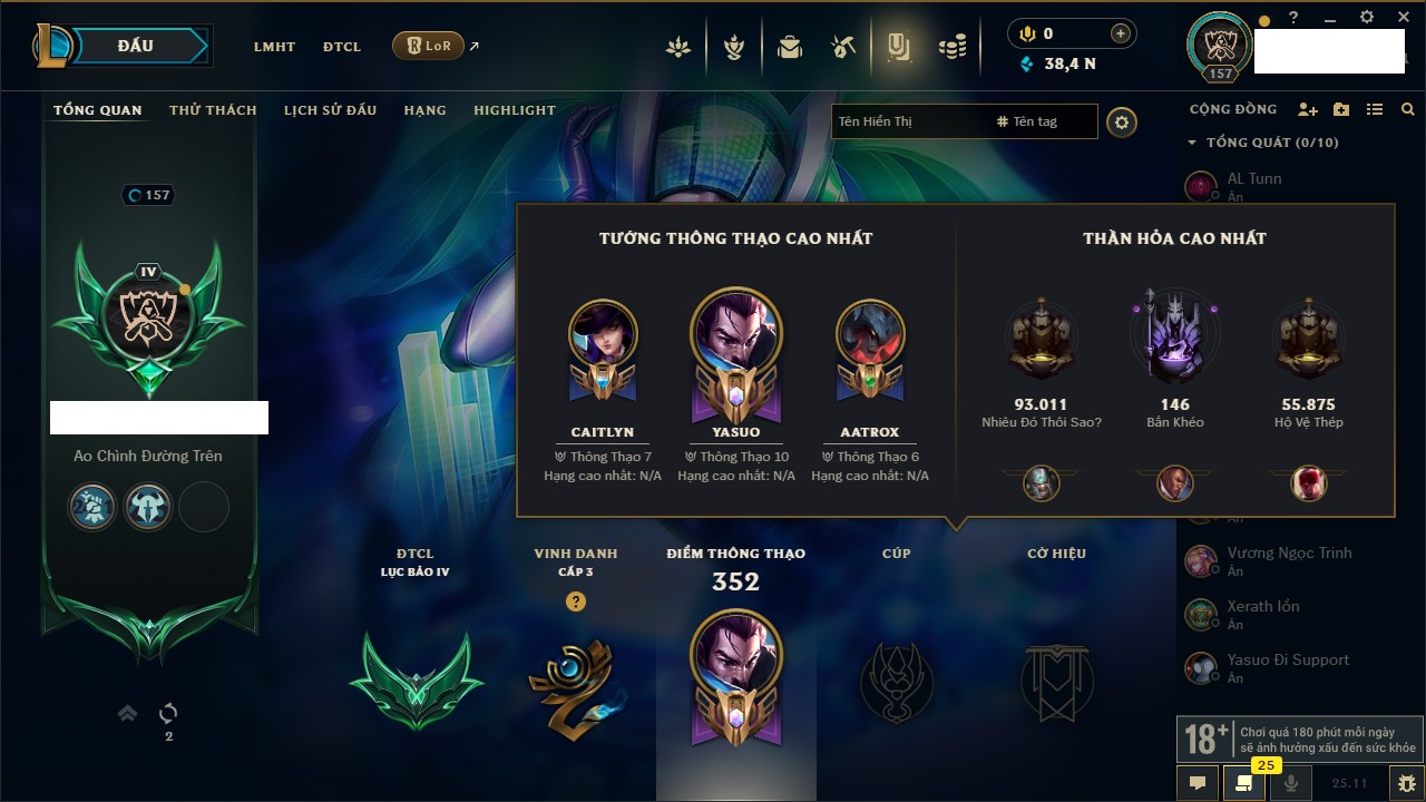 Rank Đơn: Chưa Rank Khung: Vàng Tướng: 171 - Còn 140250 THX Trang Phục: 80 Rank ĐTCL: Chưa Rank Linh Thú: 68