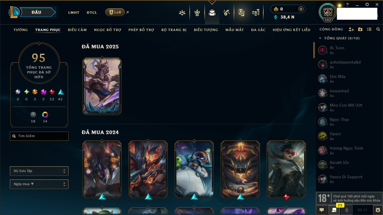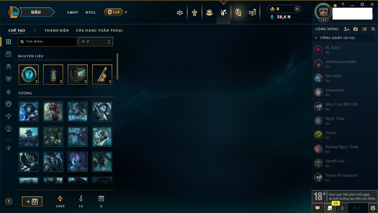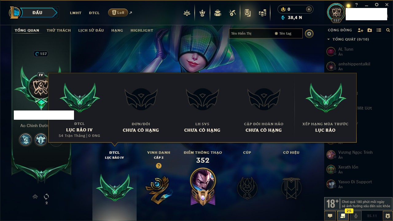 Rank Đơn: Chưa Rank Khung: Chưa có khung Tướng: 157 - Còn 51905 THX Trang Phục: 3 Rank ĐTCL: Chưa Rank Linh Thú: 175