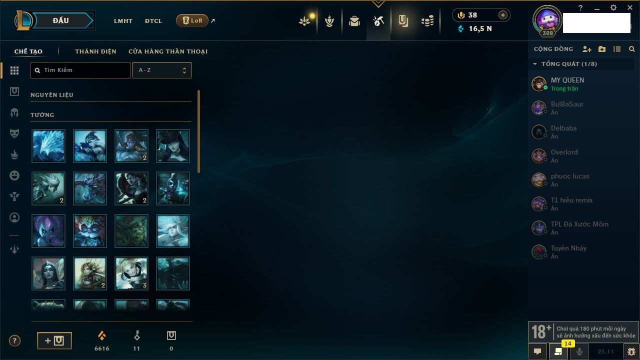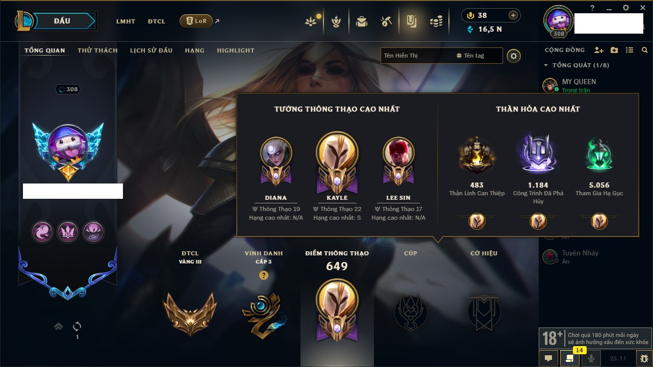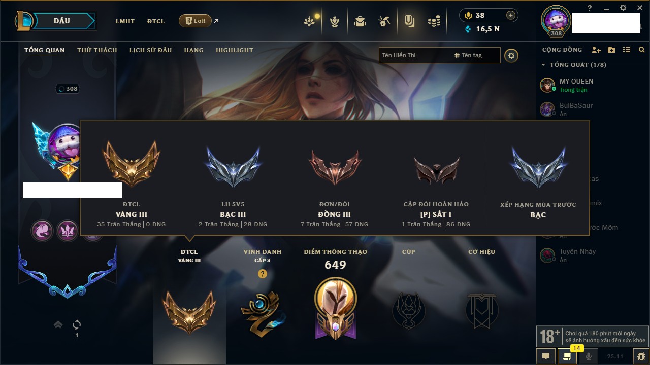 Rank Đơn: Vàng IKhung: BạcTướng: 171 - Còn 60584 THXTrang Phục: 286Rank ĐTCL: Vàng IIILinh Thú: 117