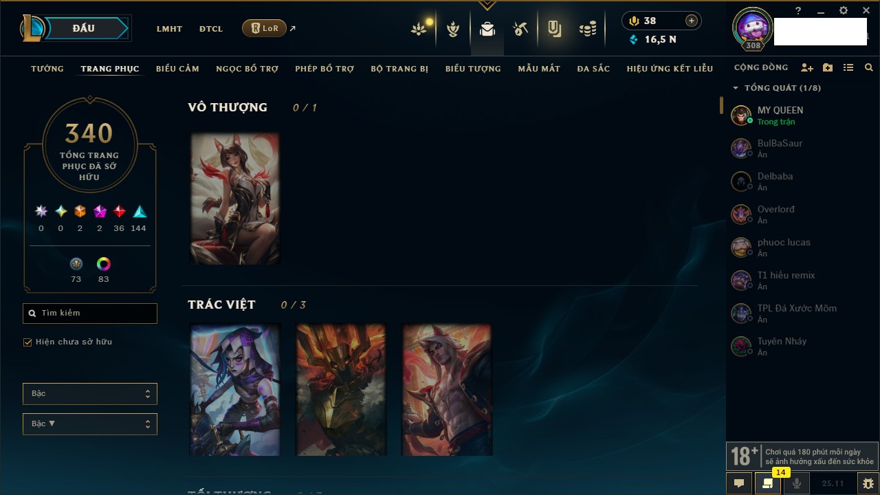 Rank Đơn: Vàng IIIKhung: VàngTướng: 171 - Còn 88128 THXTrang Phục: 329Rank ĐTCL: Chưa RankLinh Thú: 41