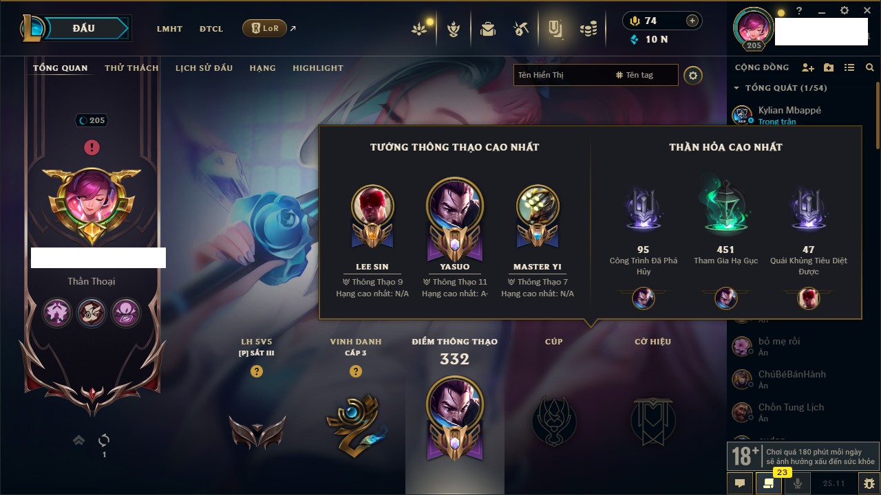 Rank Đơn: Bạch Kim IIKhung: Bạch kimTướng: 171 - Còn 265608 THXTrang Phục: 316Rank ĐTCL: Chưa RankLinh Thú: 86