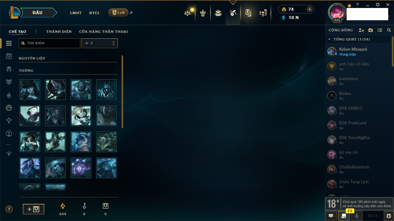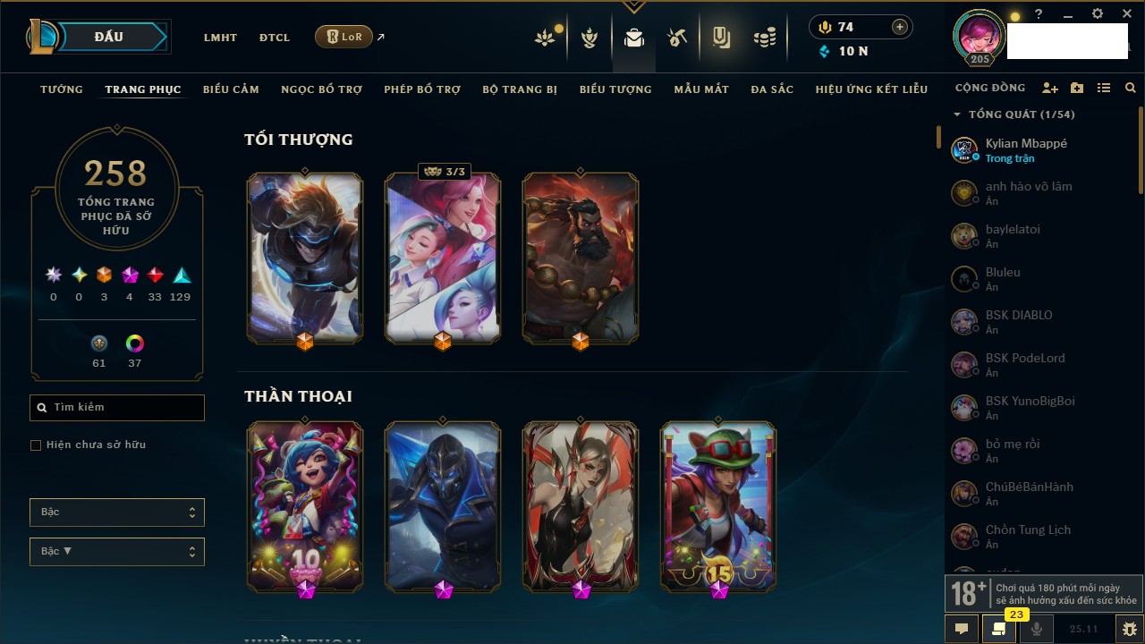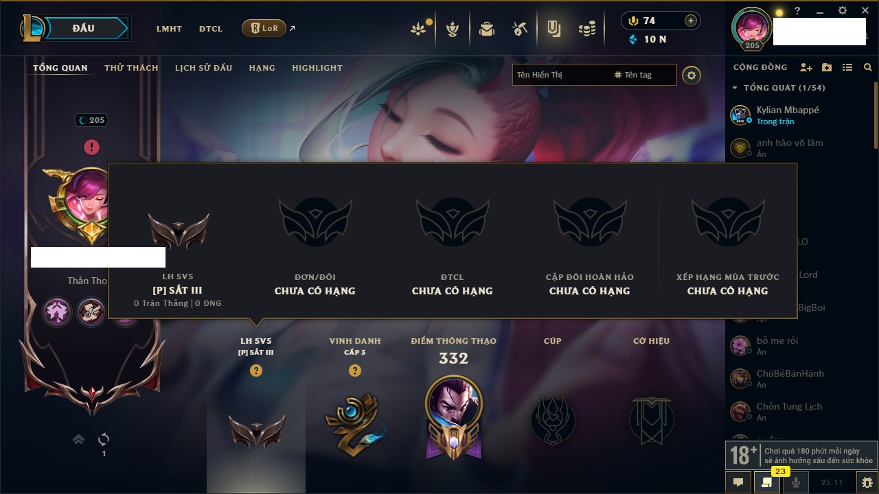 Rank Đơn: Vàng IKhung: Bạch kimTướng: 170 - Còn 212450 THXTrang Phục: 214Rank ĐTCL: Bạch Kim IVLinh Thú: 221
