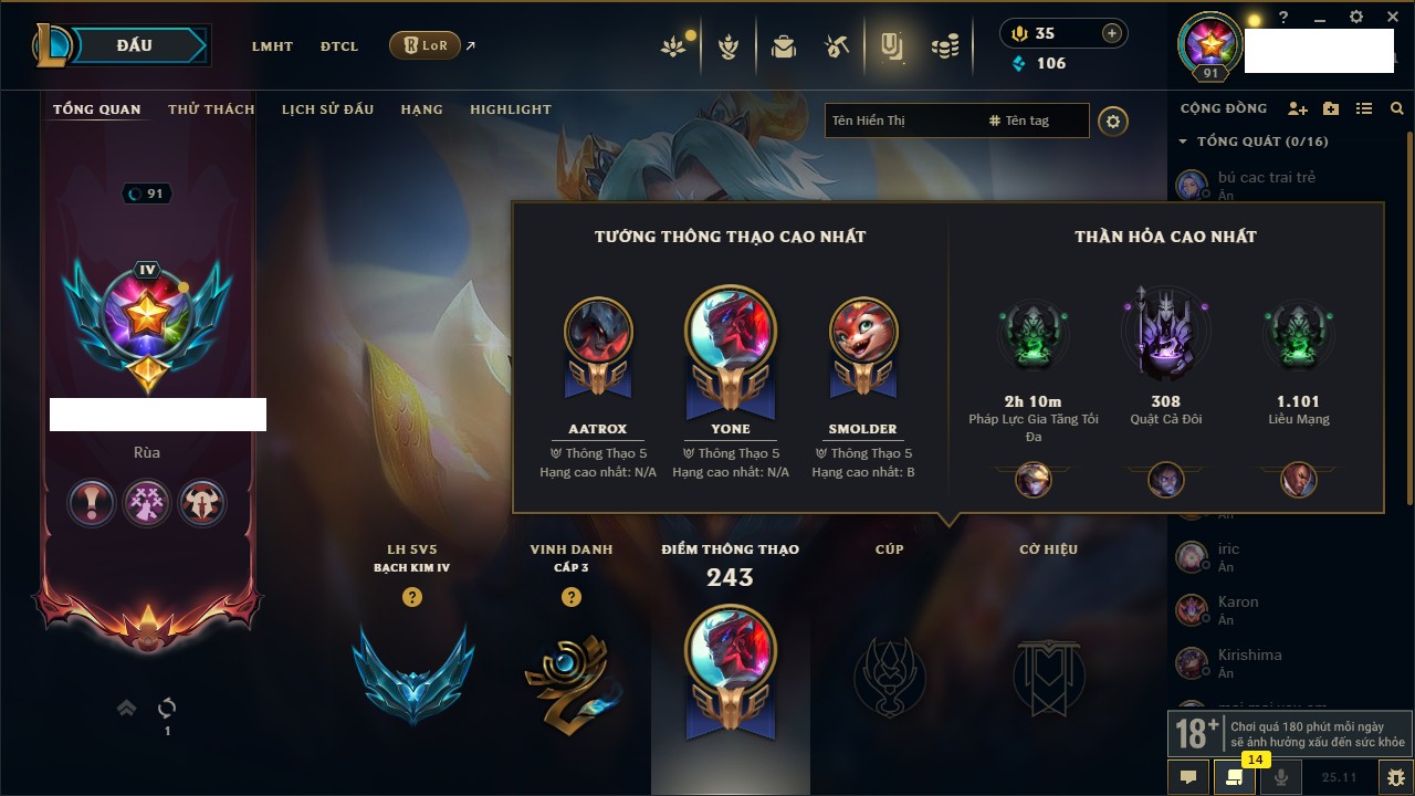 Rank Đơn: Bạch Kim IIIKhung: Bạch kimTướng: 170 - Còn 61079 THXTrang Phục: 352Rank ĐTCL: Sắt IILinh Thú: 70