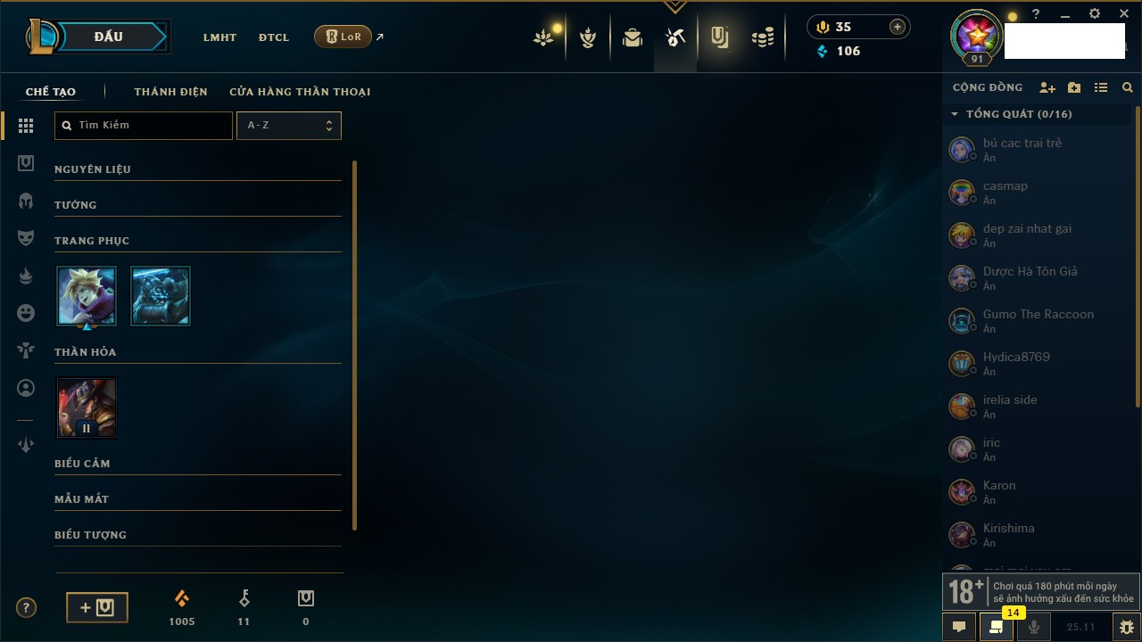 Rank Đơn: Bạch Kim IVKhung: Bạch kimTướng: 171 - Còn 182788 THXTrang Phục: 158Rank ĐTCL: Lục Bảo IVLinh Thú: 56