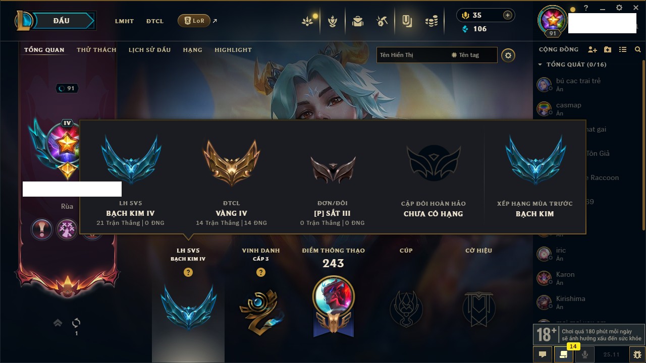 Rank Đơn: Vàng IKhung: Bạch kimTướng: 170 - Còn 212450 THXTrang Phục: 214Rank ĐTCL: Bạch Kim IVLinh Thú: 221