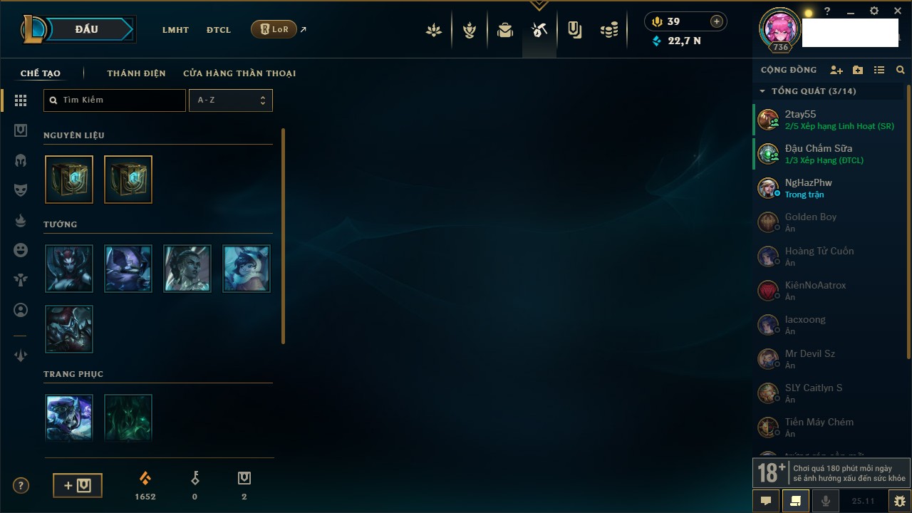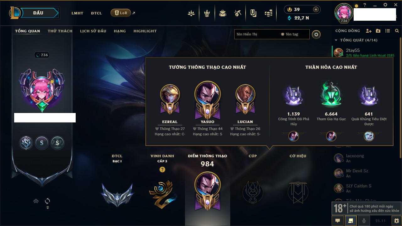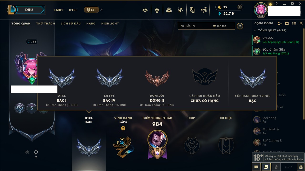 Rank Đơn: Vàng IKhung: Bạch kimTướng: 170 - Còn 212450 THXTrang Phục: 214Rank ĐTCL: Bạch Kim IVLinh Thú: 221
