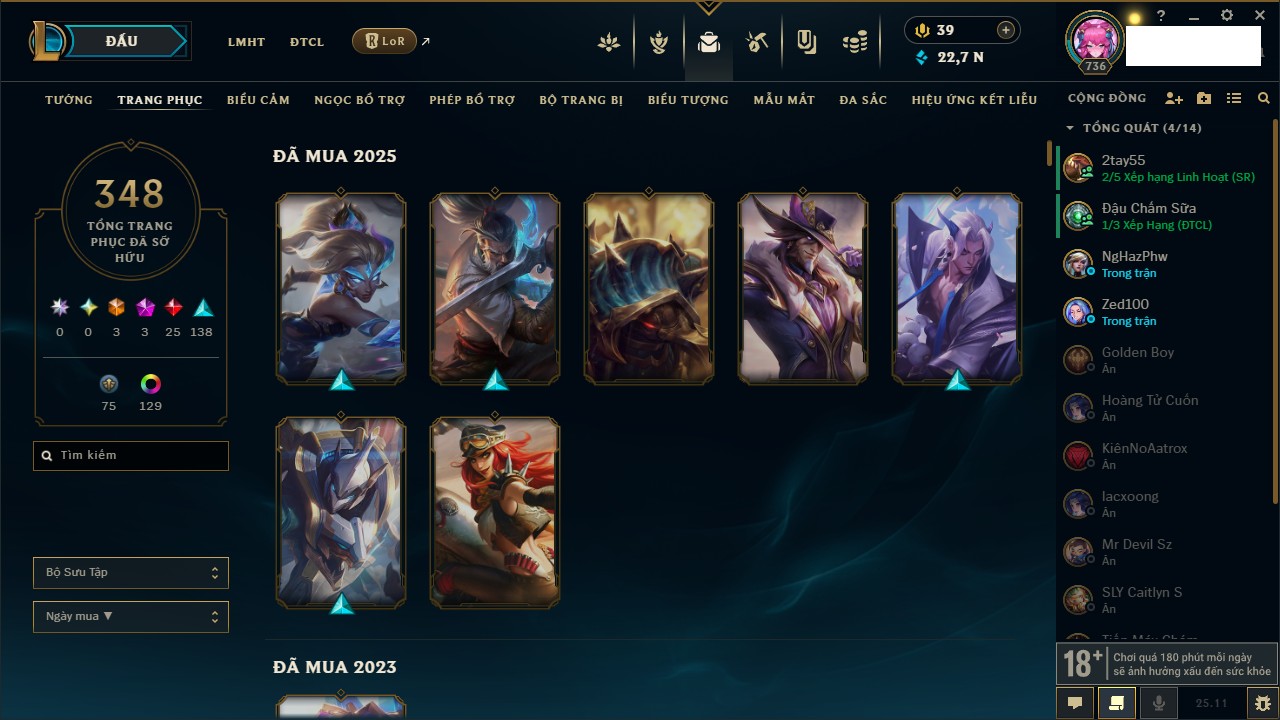 Rank Đơn: Vàng IVKhung: VàngTướng: 171 - Còn 175357 THXTrang Phục: 348Rank ĐTCL: Chưa RankLinh Thú: 46