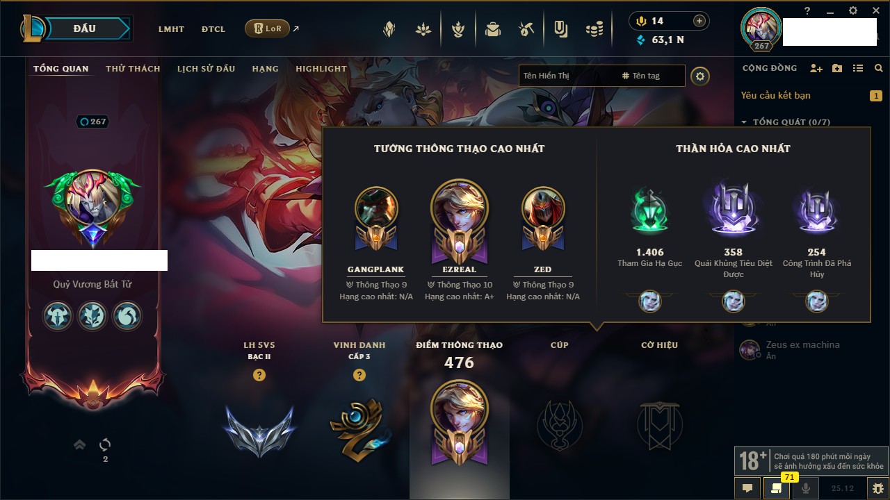 Rank Đơn: Đồng IIIKhung: ĐồngTướng: 170 - Còn 48082 THXTrang Phục: 272Rank ĐTCL: Chưa RankLinh Thú: 84