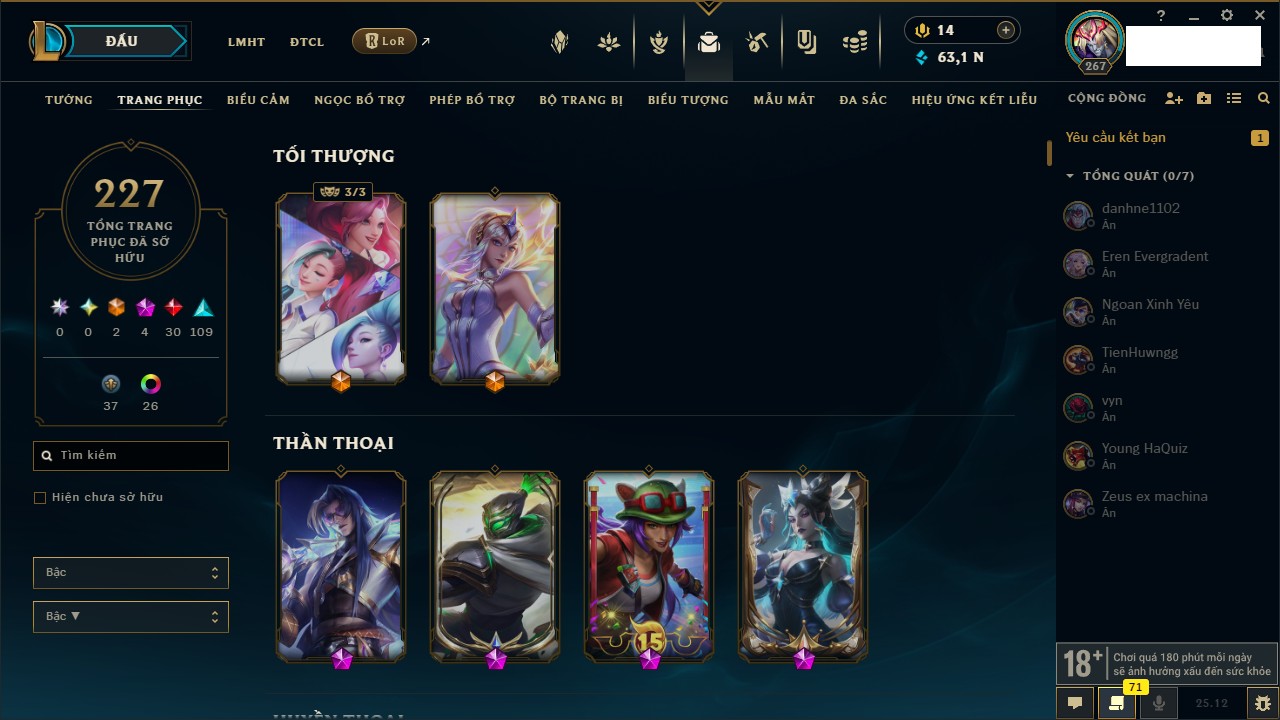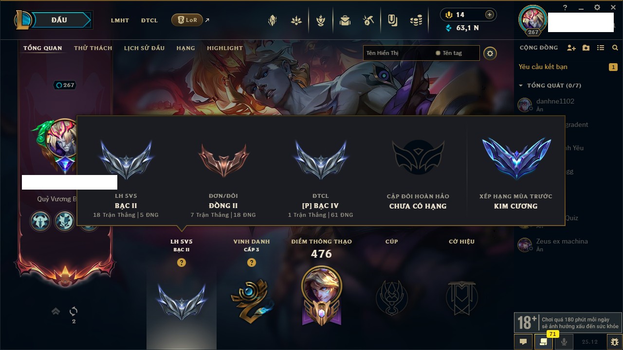 Rank Đơn: Vàng IKhung: Bạch kimTướng: 170 - Còn 212450 THXTrang Phục: 214Rank ĐTCL: Bạch Kim IVLinh Thú: 221