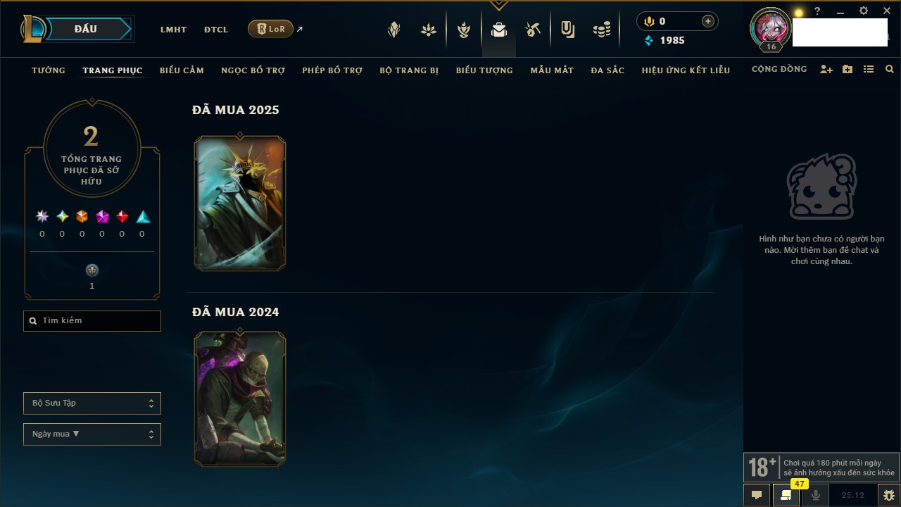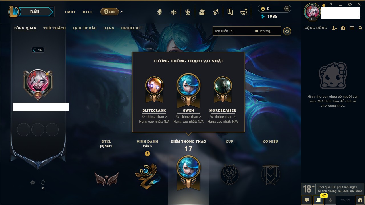 Rank Đơn: Chưa rank mùa nào Khung: Chưa có khung Tướng: 166 - Còn 3090 THX Trang Phục: 9 Rank ĐTCL: Chưa Rank Linh Thú: 125