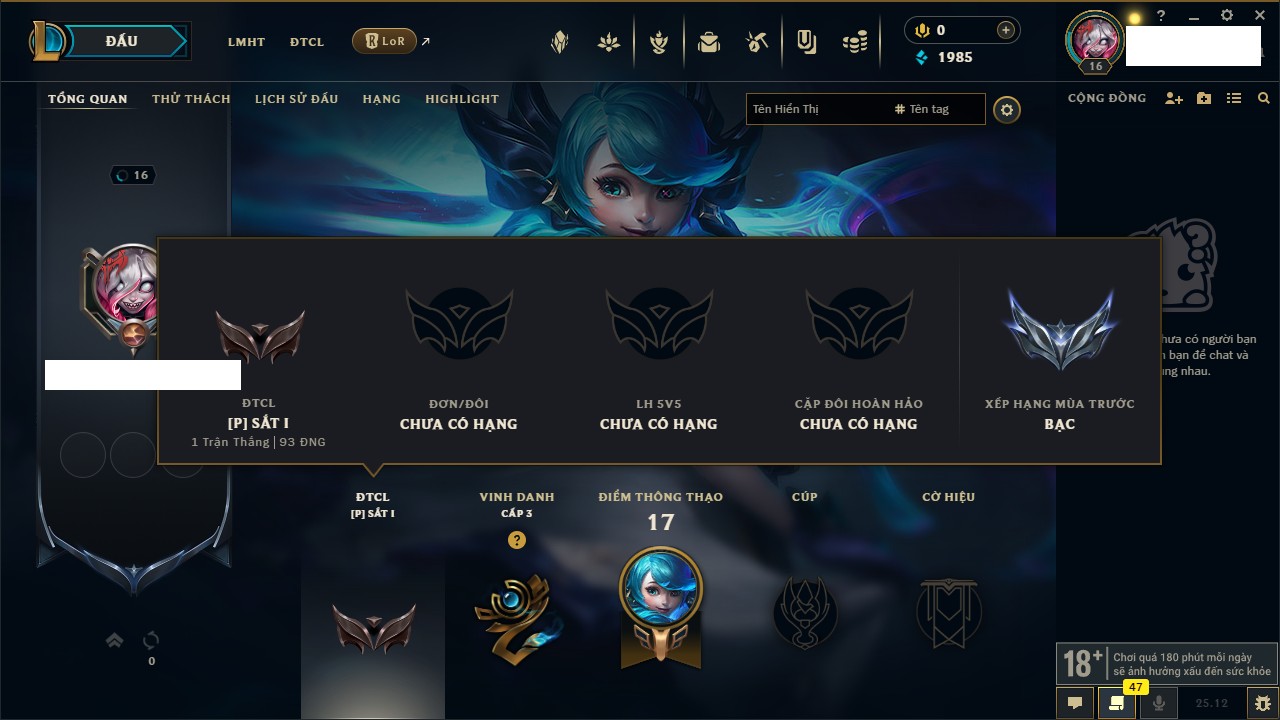 Rank Đơn: Sắt III Khung: Chưa có khung Tướng: 63 - Còn 185 THX Trang Phục: 8 Rank ĐTCL: Chưa Rank Linh Thú: 75