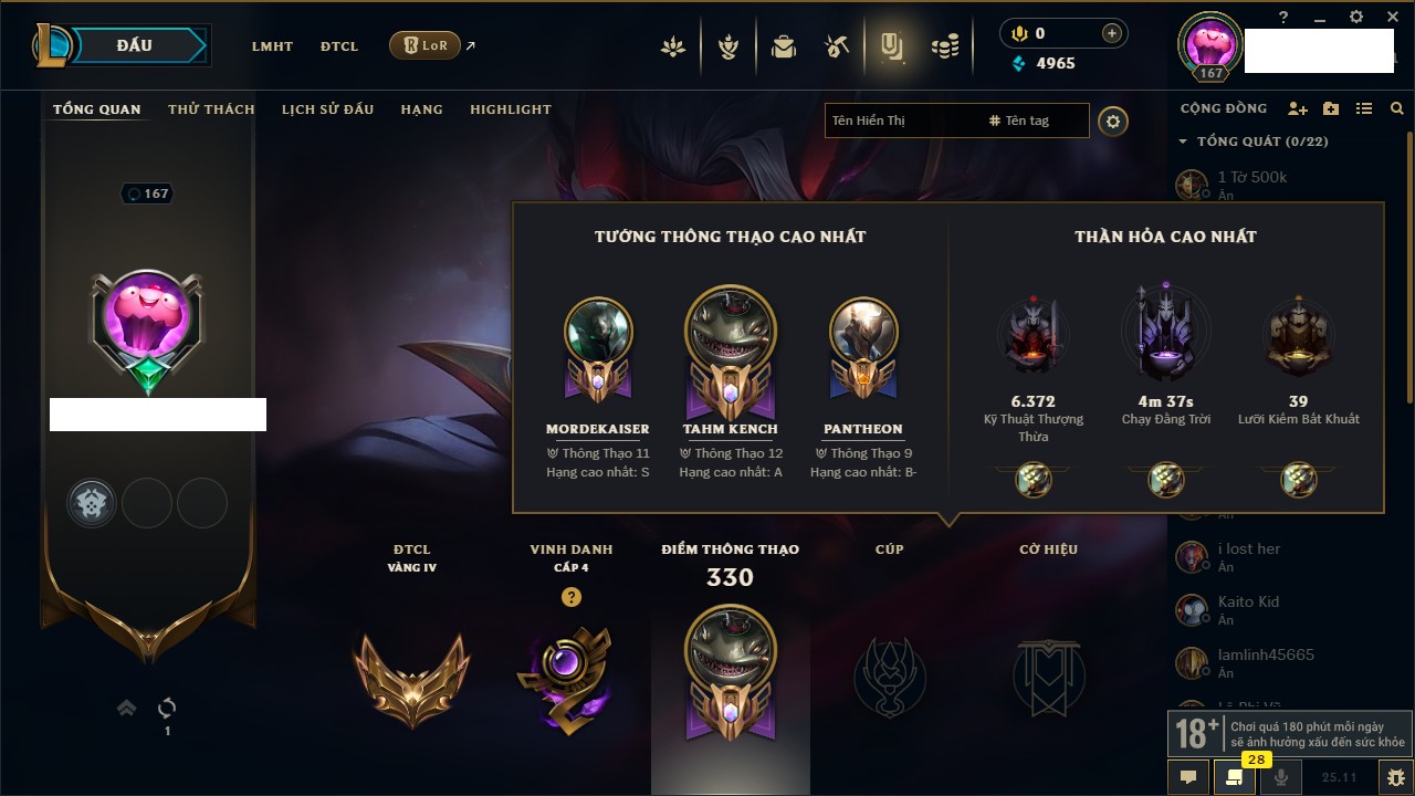 Rank Đơn: Vàng IVKhung: VàngTướng: 171 - Còn 48721 THXTrang Phục: 171Rank ĐTCL: Chưa RankLinh Thú: 27