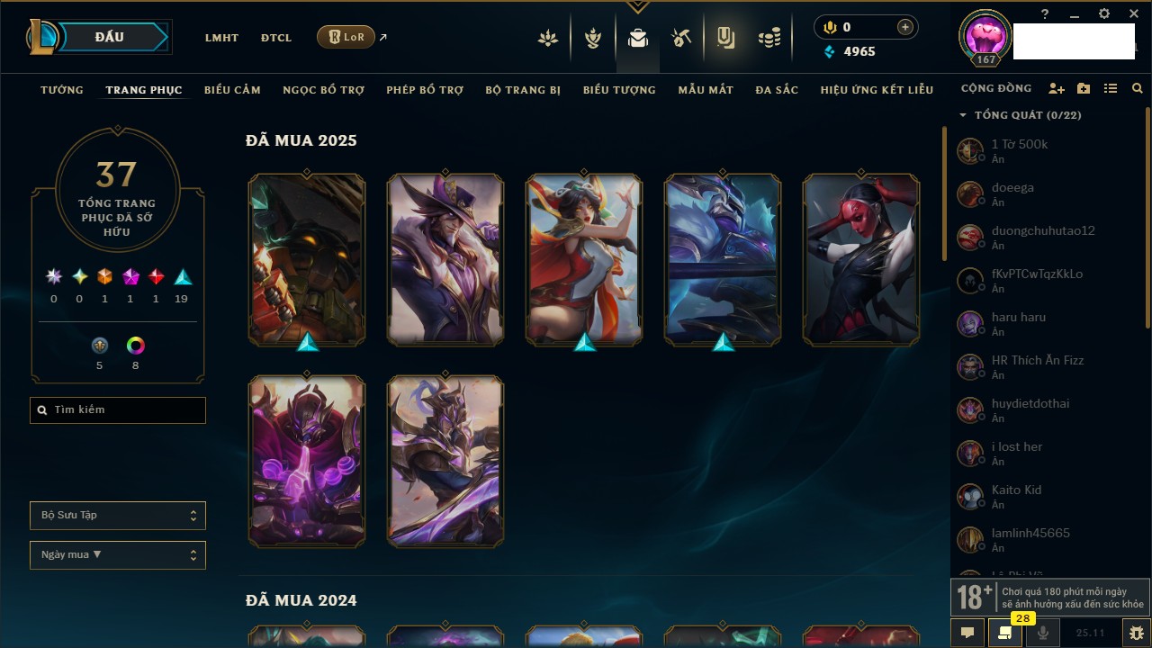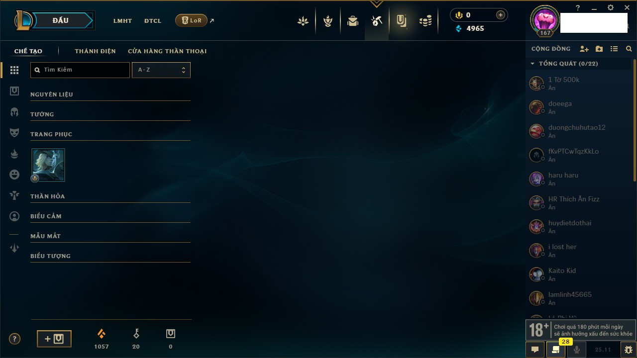 Rank Đơn: Vàng IVKhung: BạcTướng: 166 - Còn 180925 THXTrang Phục: 163Rank ĐTCL: Chưa RankLinh Thú: 67
