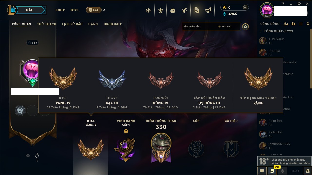 Rank Đơn: Bạc IIKhung: VàngTướng: 171 - Còn 332462 THXTrang Phục: 165Rank ĐTCL: Kim Cương IVLinh Thú: 181