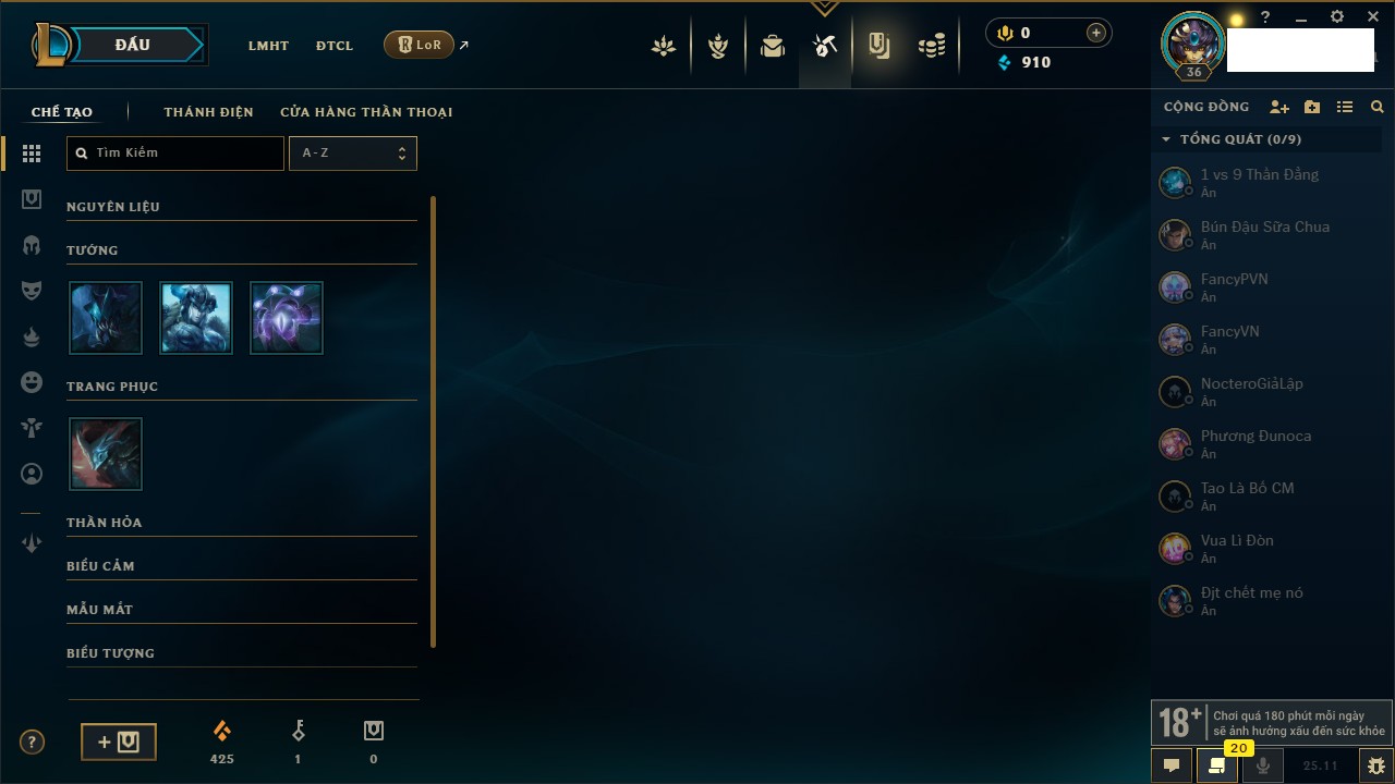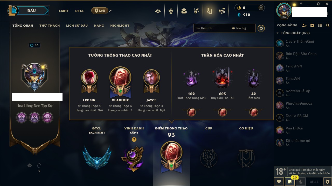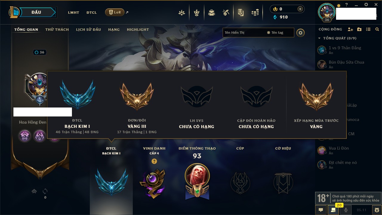 Rank Đơn: Vàng IIIKhung: BạcTướng: 56 - Còn 910 THXTrang Phục: 9Rank ĐTCL: Chưa RankLinh Thú: 31