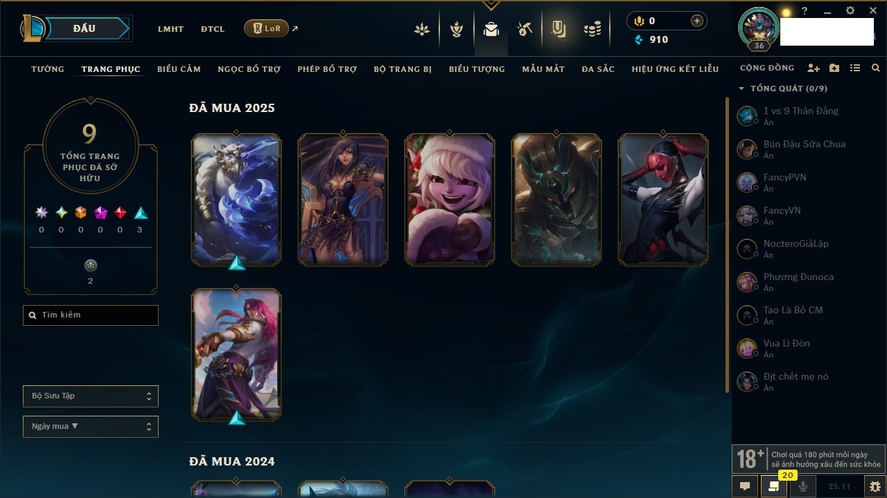 Rank Đơn: Chưa rank mùa nàoKhung: Chưa có khungTướng: 108 - Còn 6515 THXTrang Phục: 23Rank ĐTCL: Chưa RankLinh Thú: 111