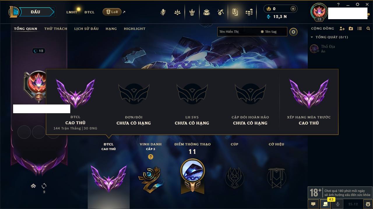 Rank Đơn: Bạc IIIKhung: Chưa có khungTướng: 171 - Còn 21493 THXTrang Phục: 252Rank ĐTCL: Bạch Kim IVLinh Thú: 123