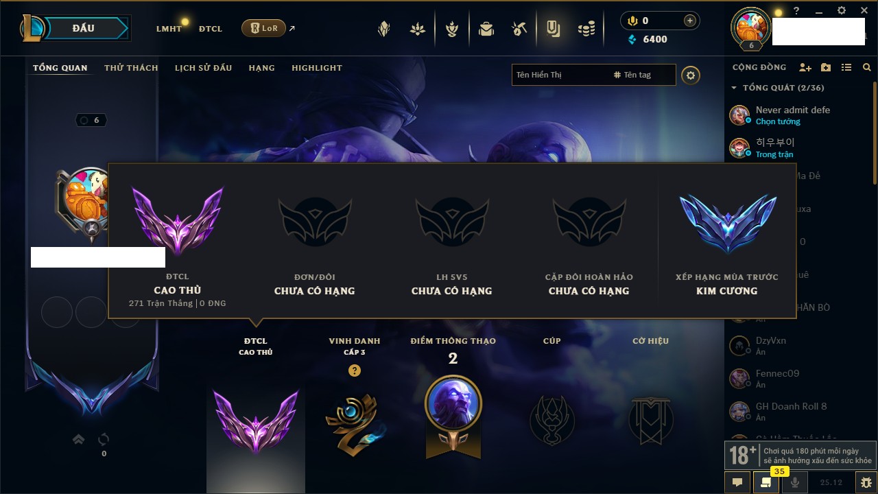 Rank Đơn: Chưa rank mùa nàoKhung: Chưa có khungTướng: 2 - Còn 9000 THXTrang Phục: 0Rank ĐTCL: Bạch Kim IIILinh Thú: 31