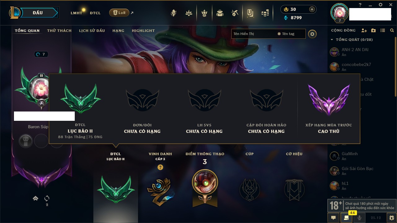 Rank Đơn: Lục Bảo IVKhung: VàngTướng: 171 - Còn 154648 THXTrang Phục: 203Rank ĐTCL: Bạch Kim IVLinh Thú: 69