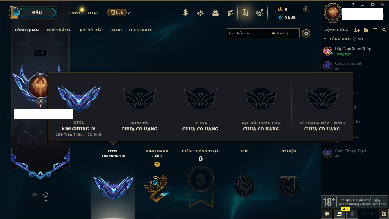 Rank Đơn: Bạc IIKhung: VàngTướng: 171 - Còn 332462 THXTrang Phục: 165Rank ĐTCL: Kim Cương IVLinh Thú: 181