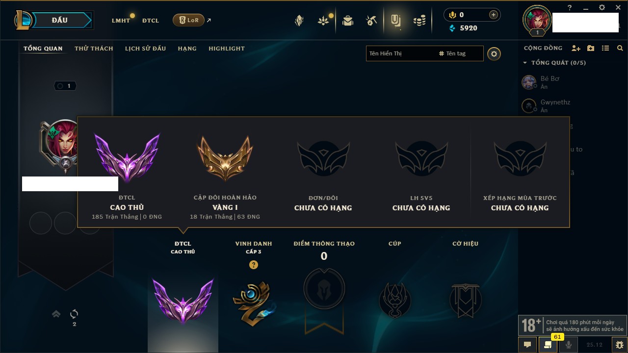 Rank Đơn: Chưa rank mùa nàoKhung: Chưa có khungTướng: 0 - Còn 6300 THXTrang Phục: 0Rank ĐTCL: Bạc IIILinh Thú: 3