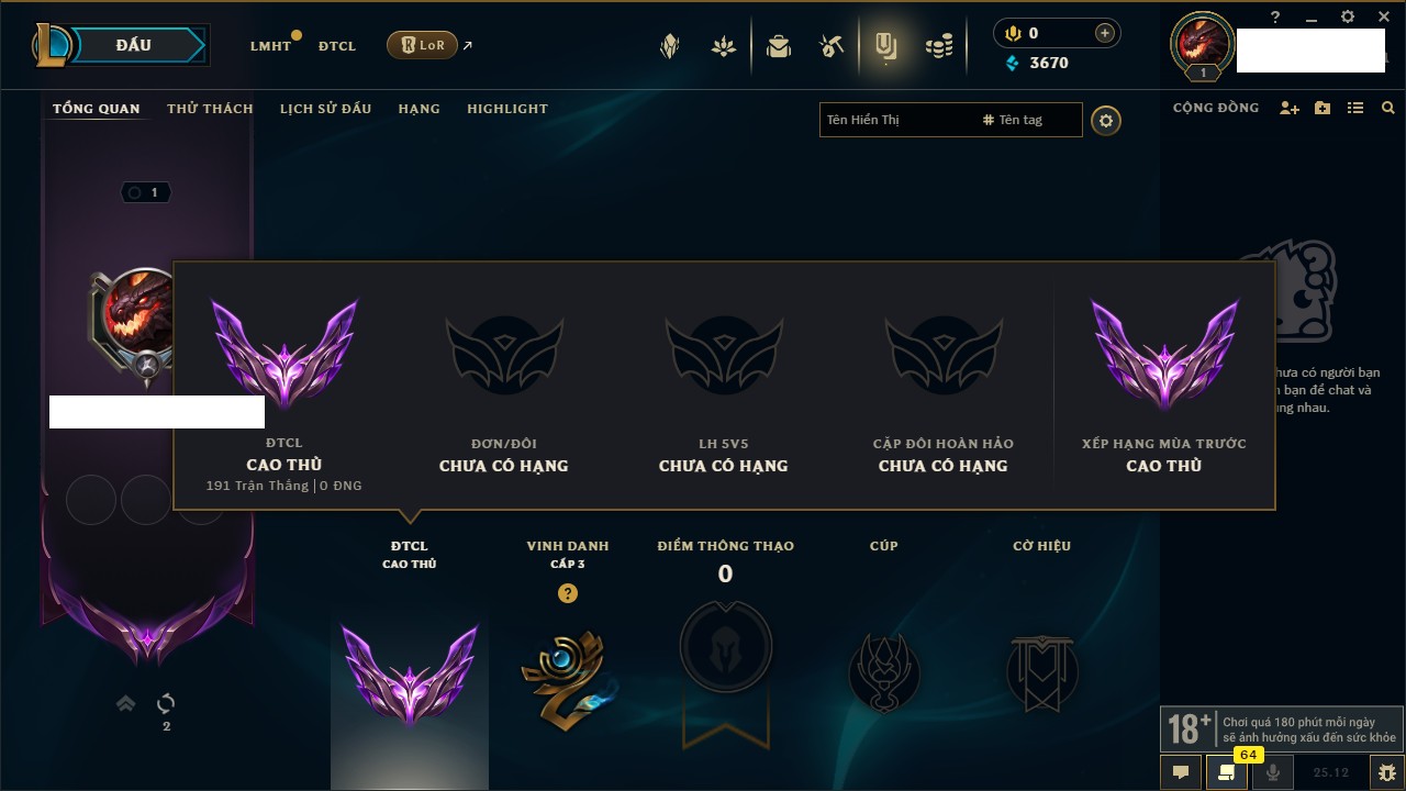 Rank Đơn: Chưa rank mùa nàoKhung: Chưa có khungTướng: 0 - Còn 4000 THXTrang Phục: 0Rank ĐTCL: Đồng ILinh Thú: 18