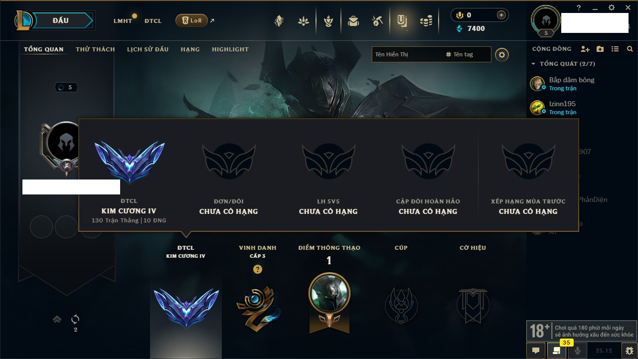 Rank Đơn: Sắt IVKhung: SắtTướng: 171 - Còn 231744 THXTrang Phục: 376Rank ĐTCL: Bạch Kim IILinh Thú: 120