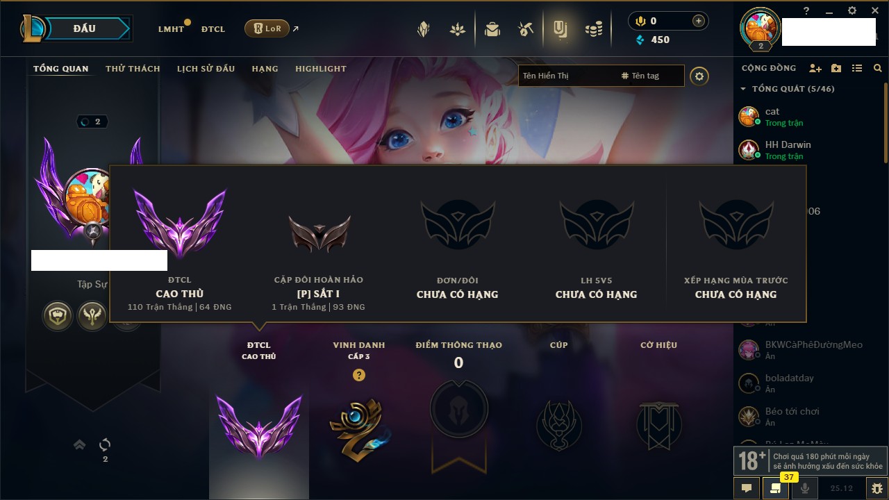 Rank Đơn: Chưa rank mùa nàoKhung: Chưa có khungTướng: 2 - Còn 9000 THXTrang Phục: 0Rank ĐTCL: Bạch Kim IIILinh Thú: 31