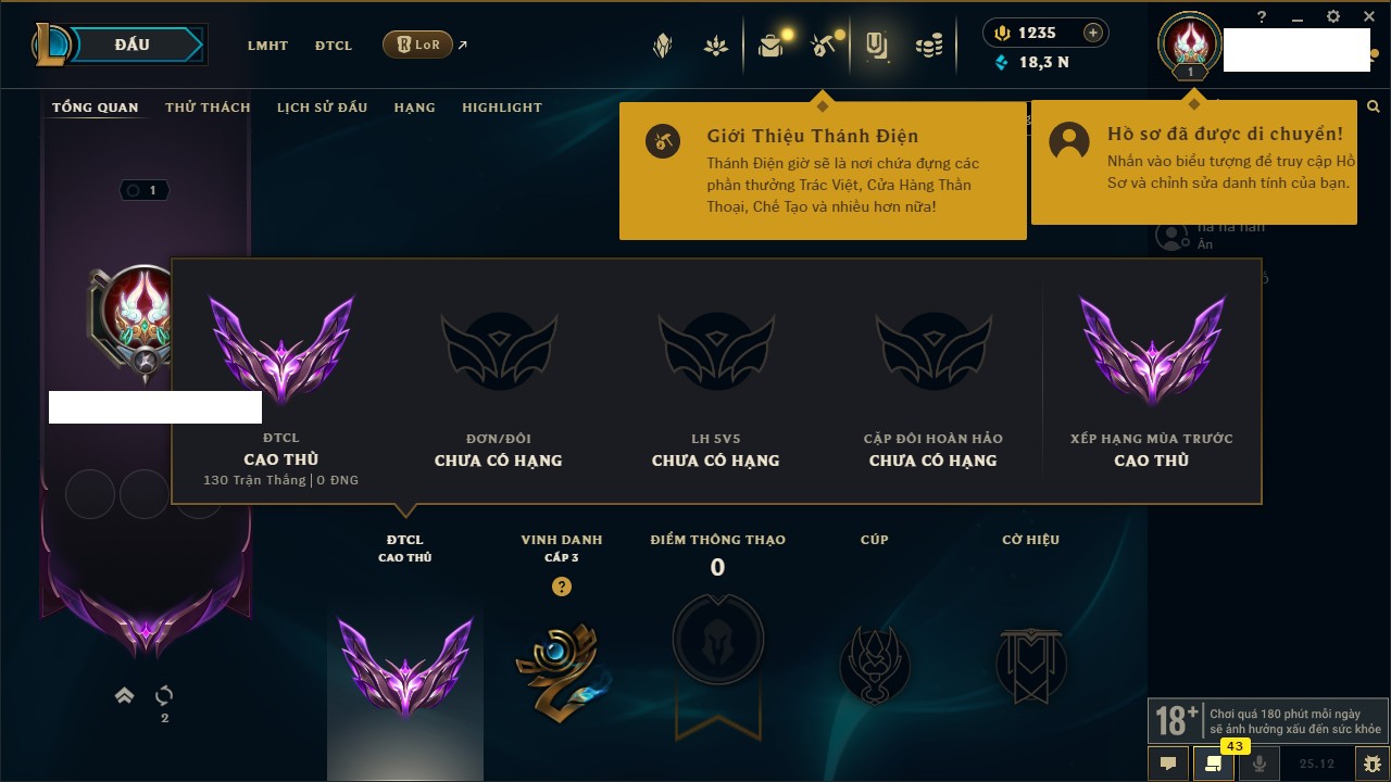 Rank Đơn: Bạc IIIKhung: Chưa có khungTướng: 171 - Còn 21493 THXTrang Phục: 252Rank ĐTCL: Bạch Kim IVLinh Thú: 123